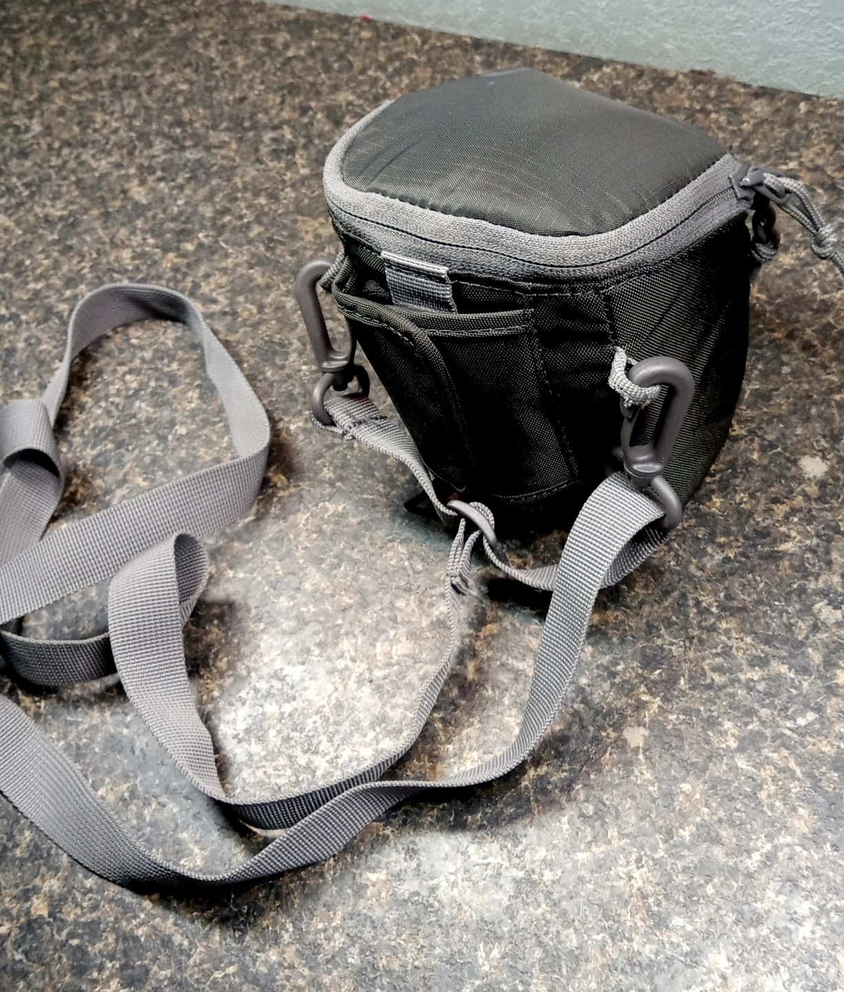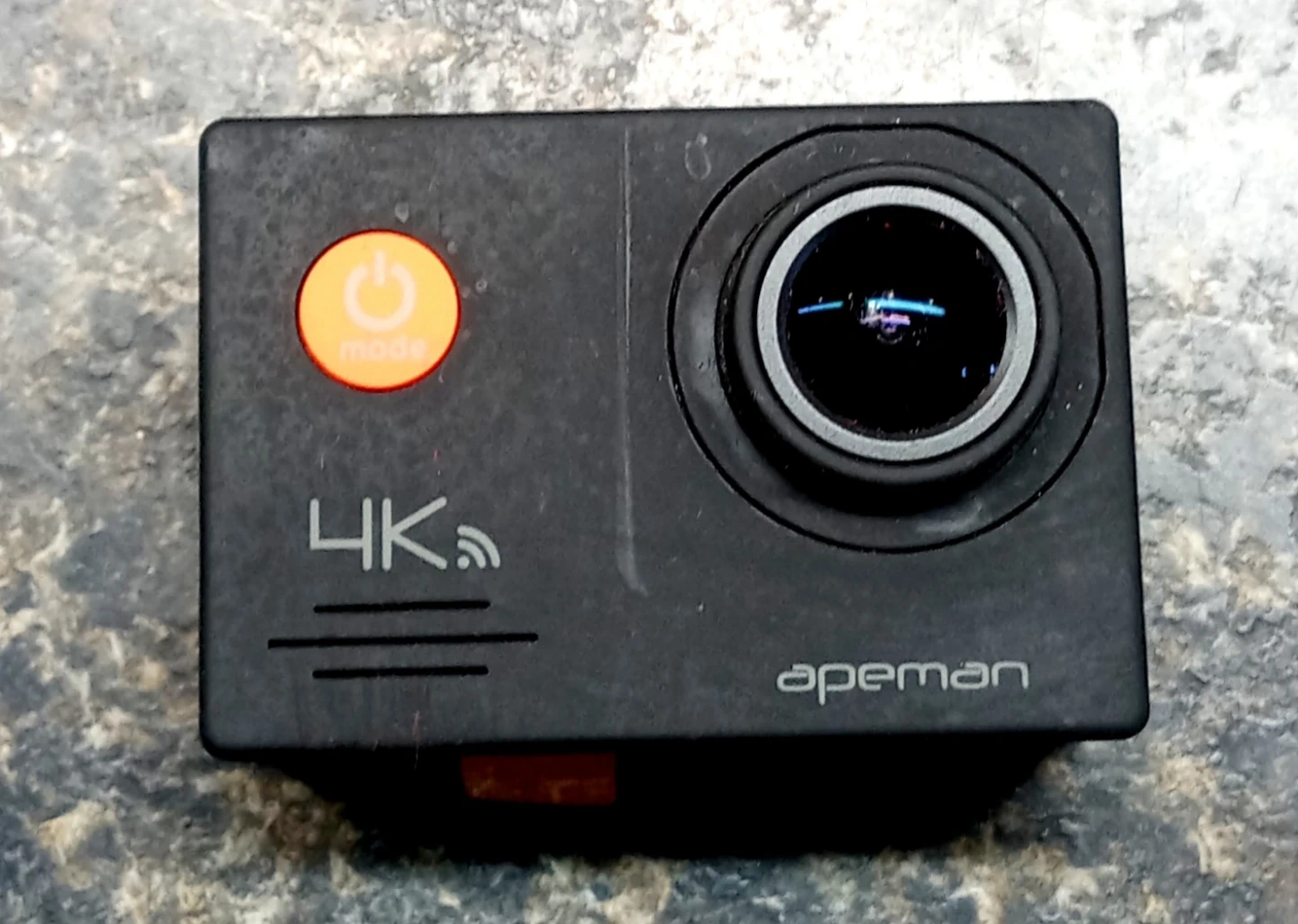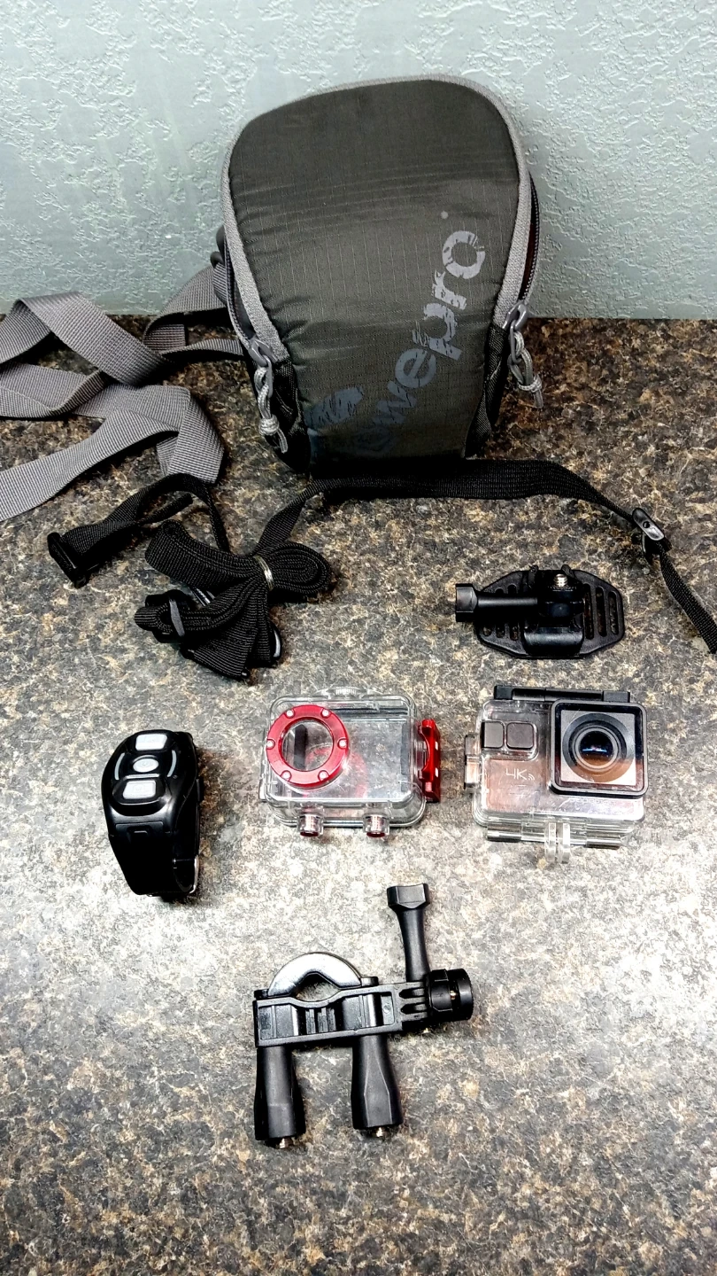 This Apeman action camera captures video in 4K resolution. It comes with a waterproof case, a remote control, a mount, and a Lowepro carrying bag. Perfect for capturing adventures!