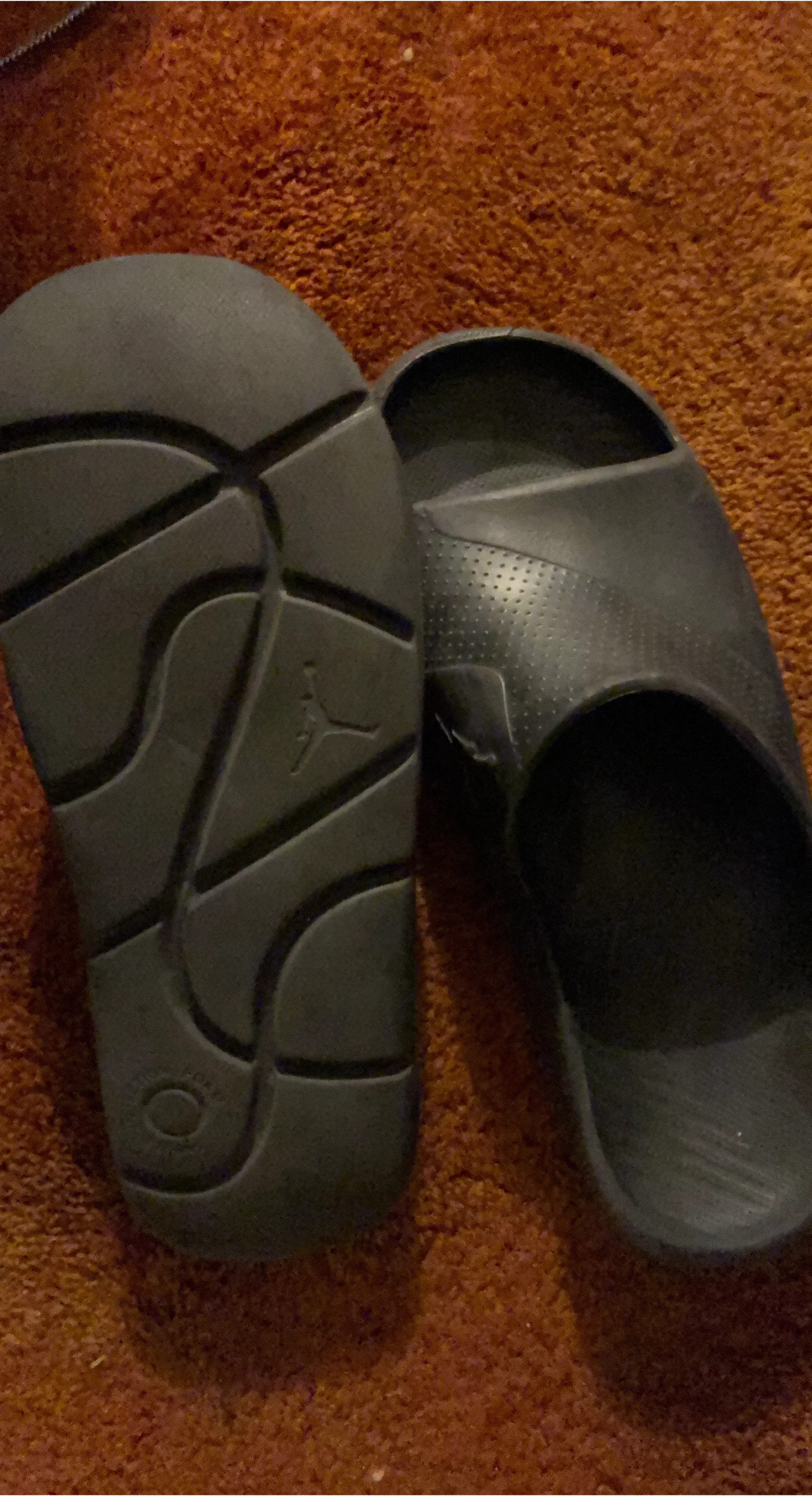 These are black Jordan slides. They're made of a durable rubber material. Perfect for lounging or post-workout comfort!