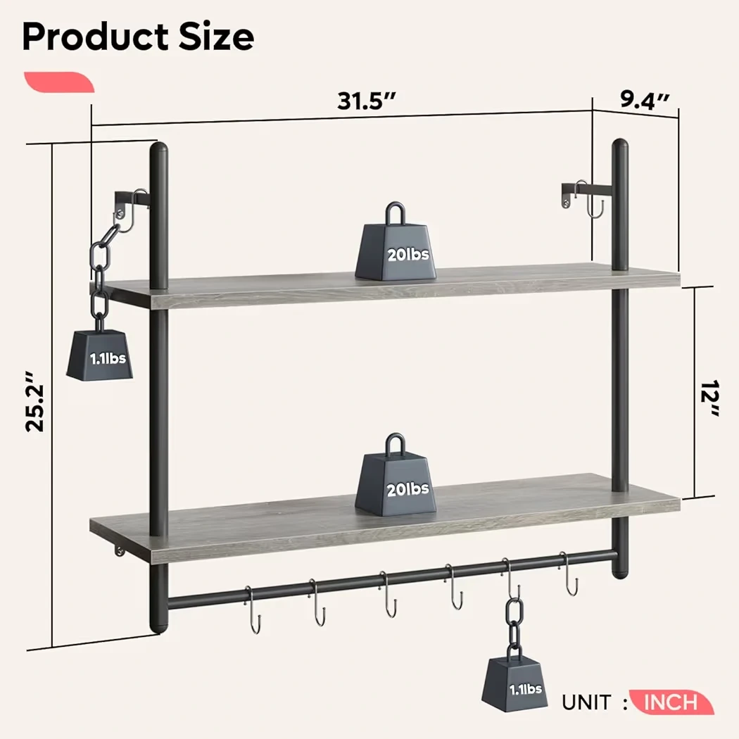 This two-tier wall shelf features a rustic wood finish and black metal frame and a hanging bar. Its dimensions are 31.5" W x 9.4" D x 25.2" H. This shelf is great for organizing kitchens, bathrooms, or entryways!