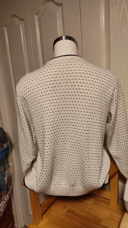 Soft white cardigan sweater with black V-accent pattern. This cute retro-style cardigan is a size small/medium and is in new condition. Pick up in Mississauga, near Britania Rd and Ninth Line. Asking $12. obo.
