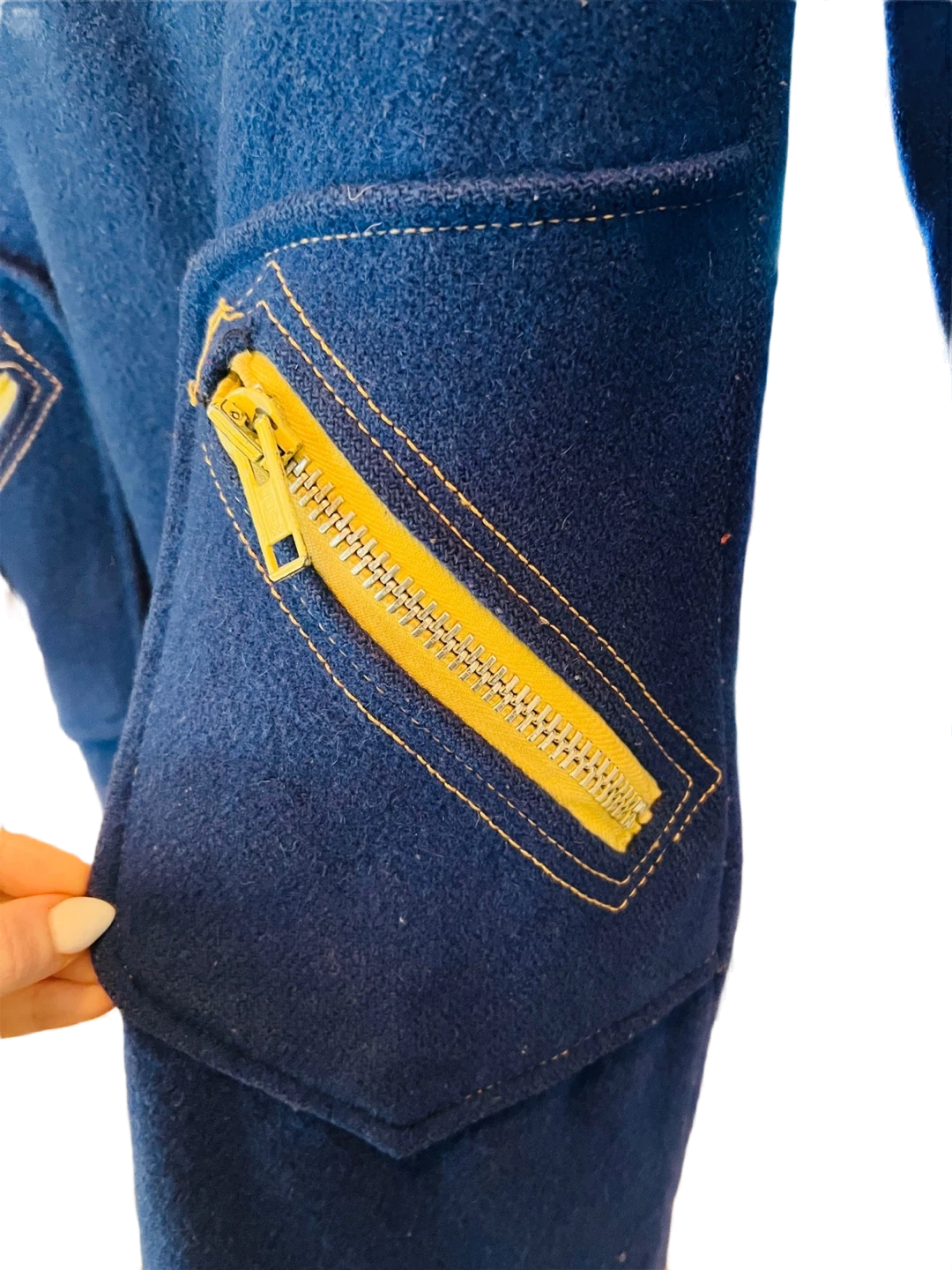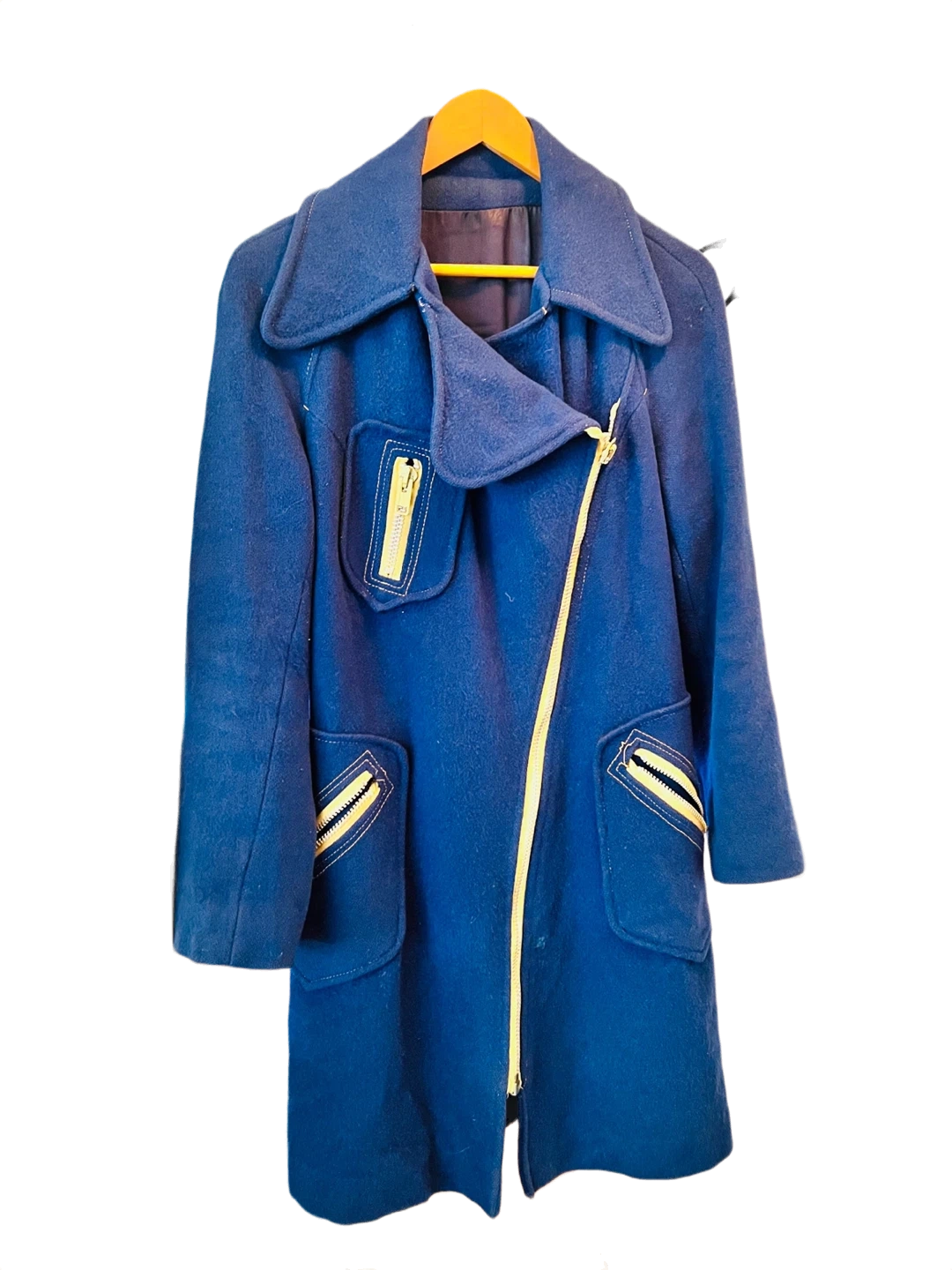 Stylish vintage La Clique French royal blue wool coat. It has a unique design with yellow zippers, three pockets, and an off-center zipper close. Purchased in London from a vintage shop.