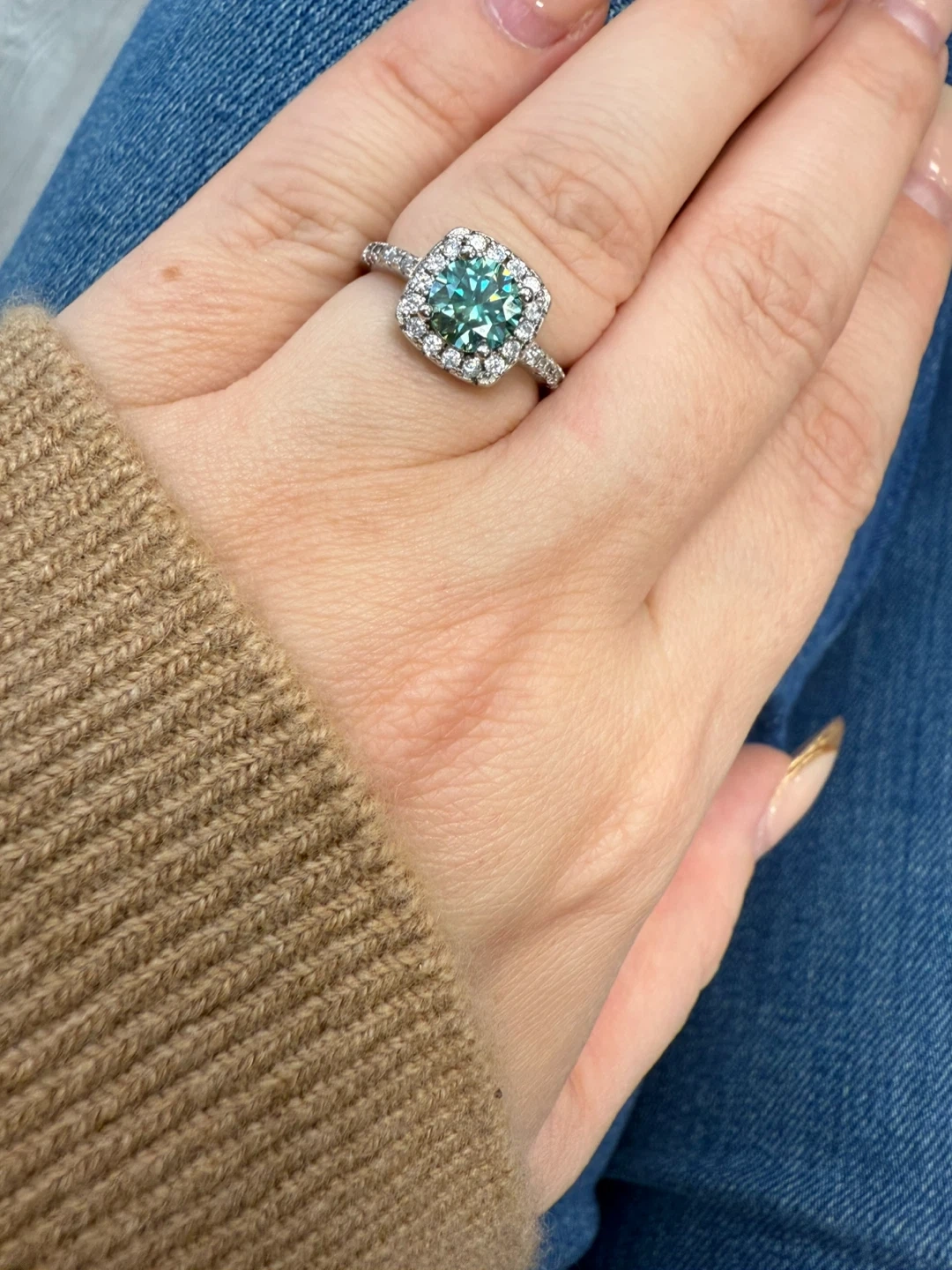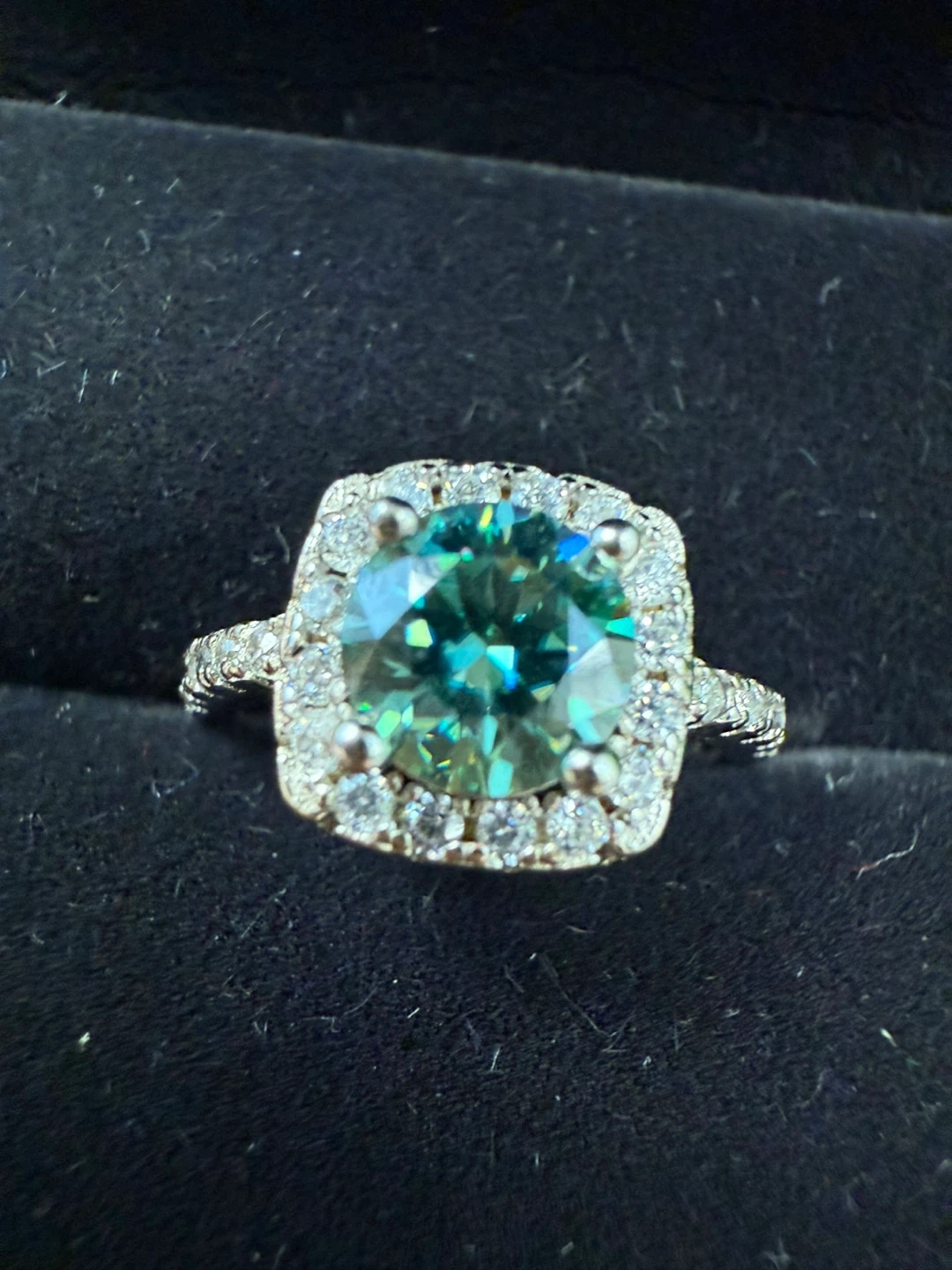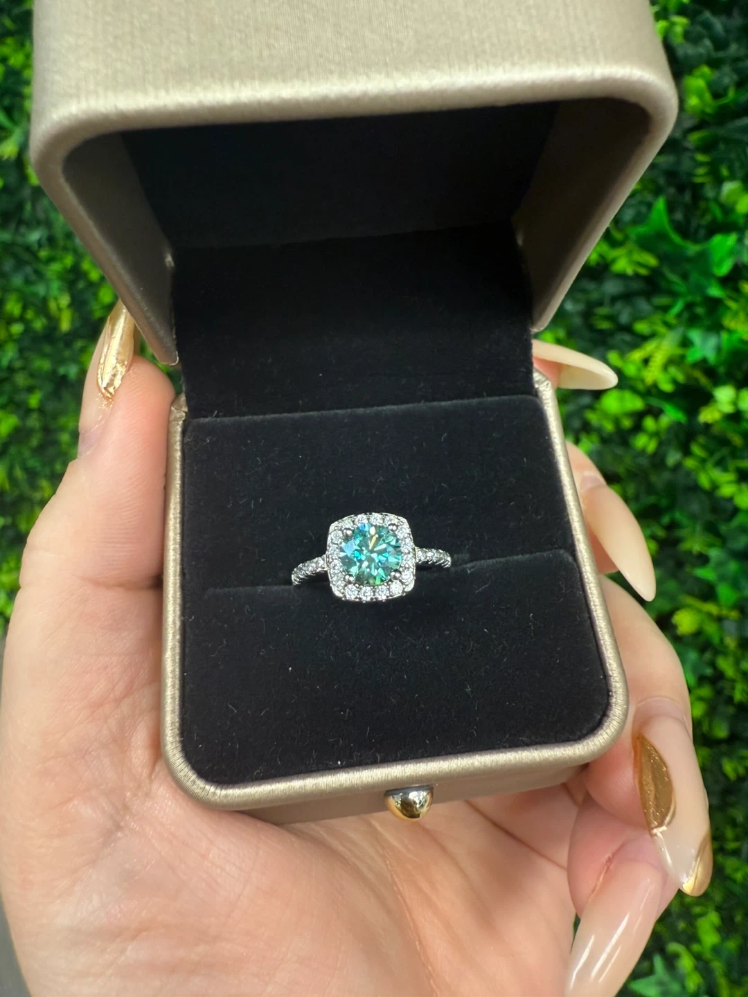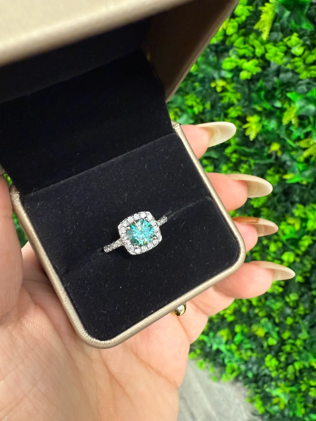 Brand new sterling silver ring features a stunning 1 Carat Turquoise Moissanite centre stone surrounded by a halo of smaller stones. The band is also embellished with pave-set stones. It's a lovely piece for any occasion! Comes with GRA documentation certificate and card.