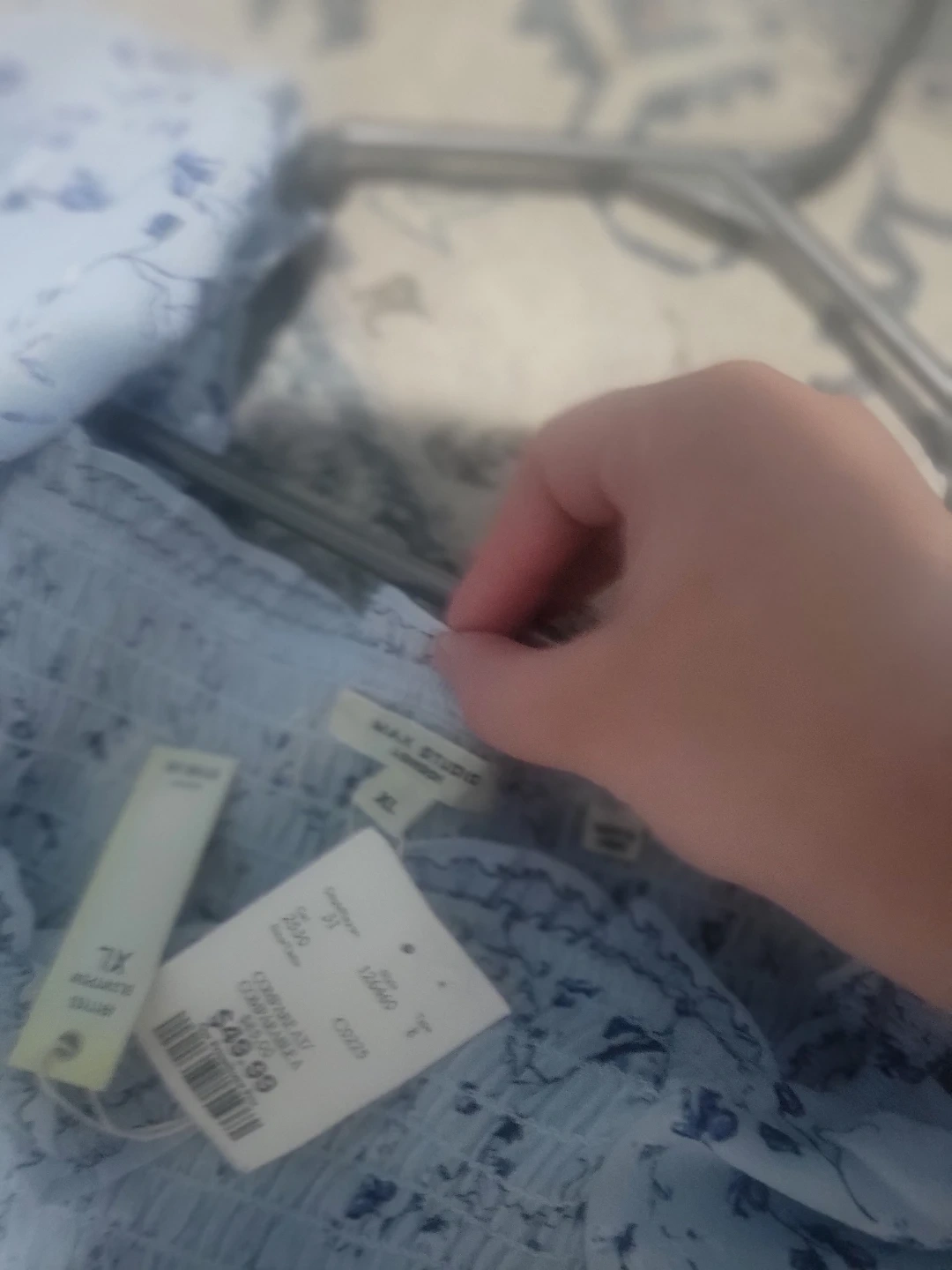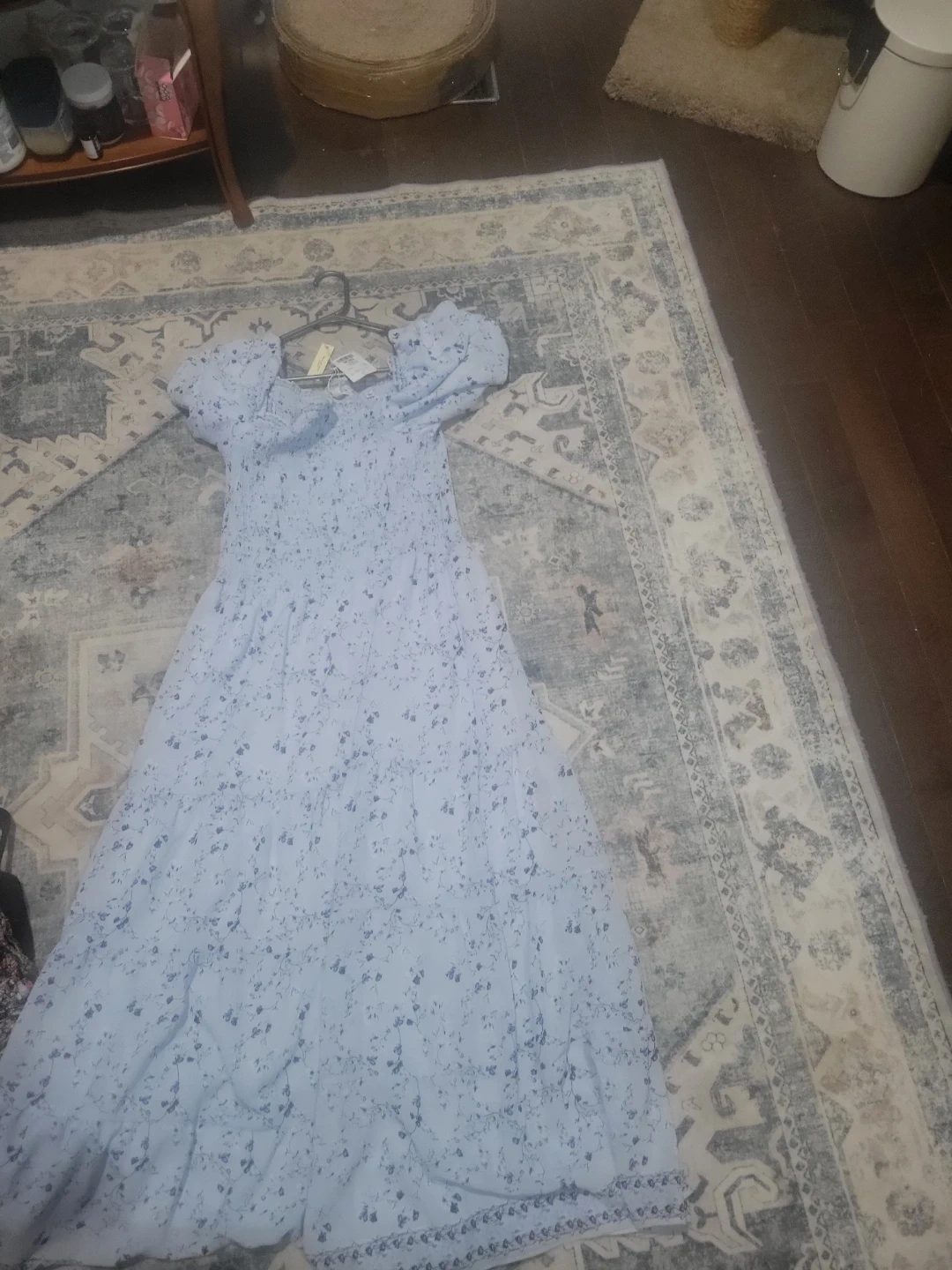 Light blue smocked maxi dress with a delicate floral print. This dress is a size XL. It's perfect for warm weather occasions! It has puff sleeves and a tiered skirt.