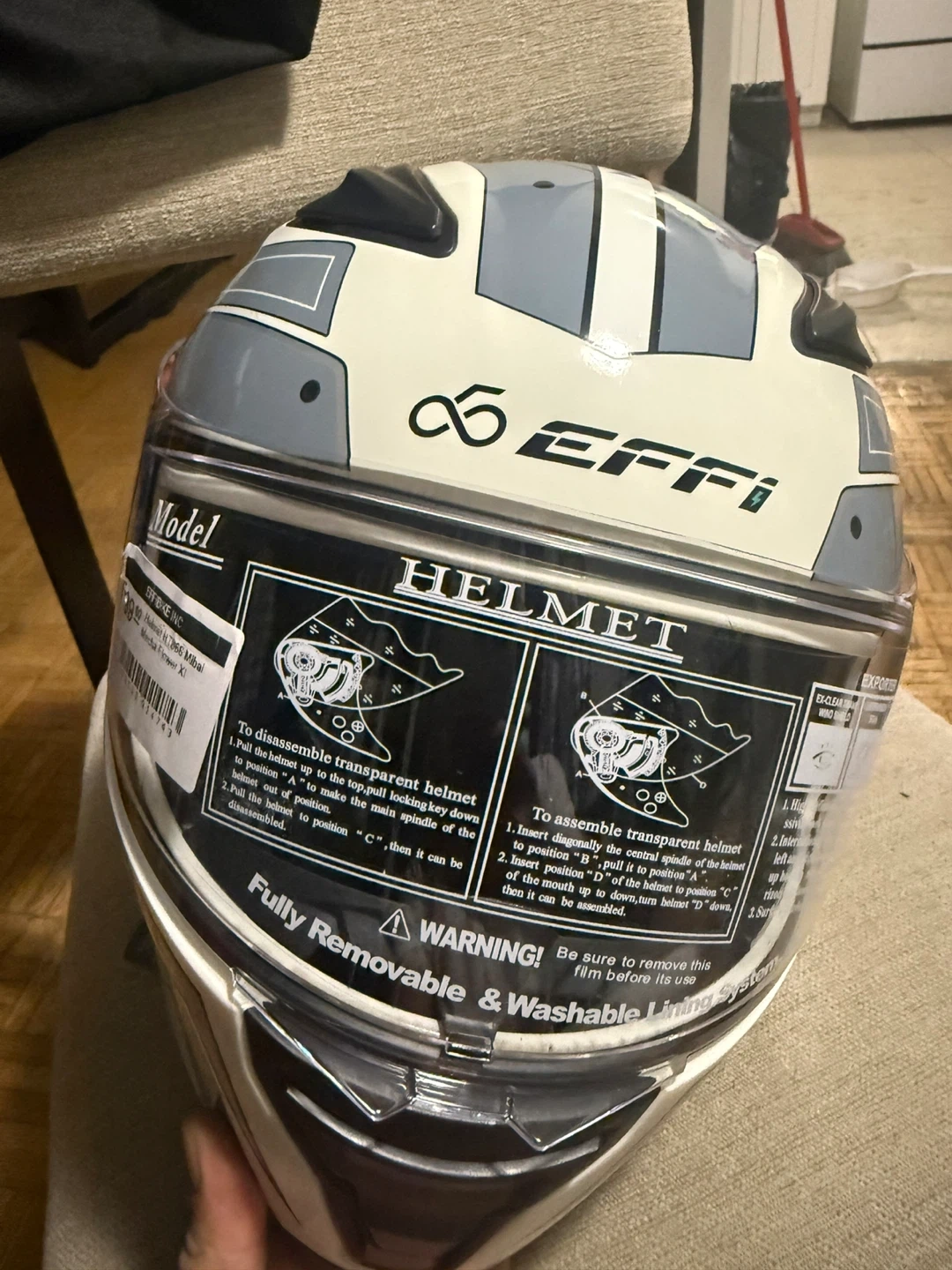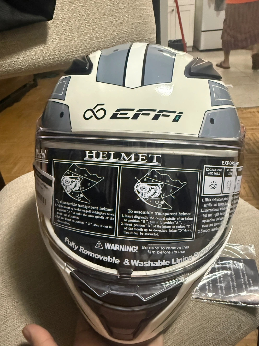 This is an EFFI brand motorcycle helmet. It features a removable and washable lining system. High-definition photo lining with transmission not lower than 85% of visible light.