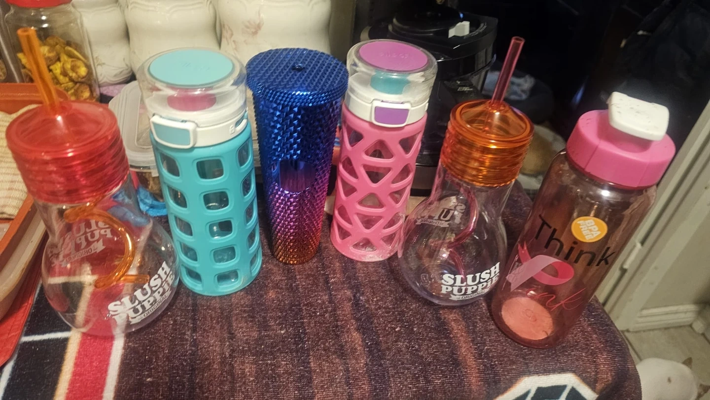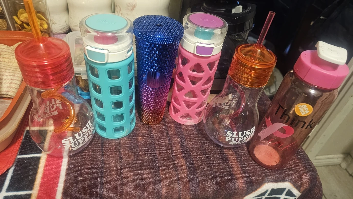 Includes 'Slush Puppie' style lightbulb tumblers with straws, a diamond-patterned tumbler, and various water bottles. BPA-free bottles are included. These are great for staying hydrated on the go!