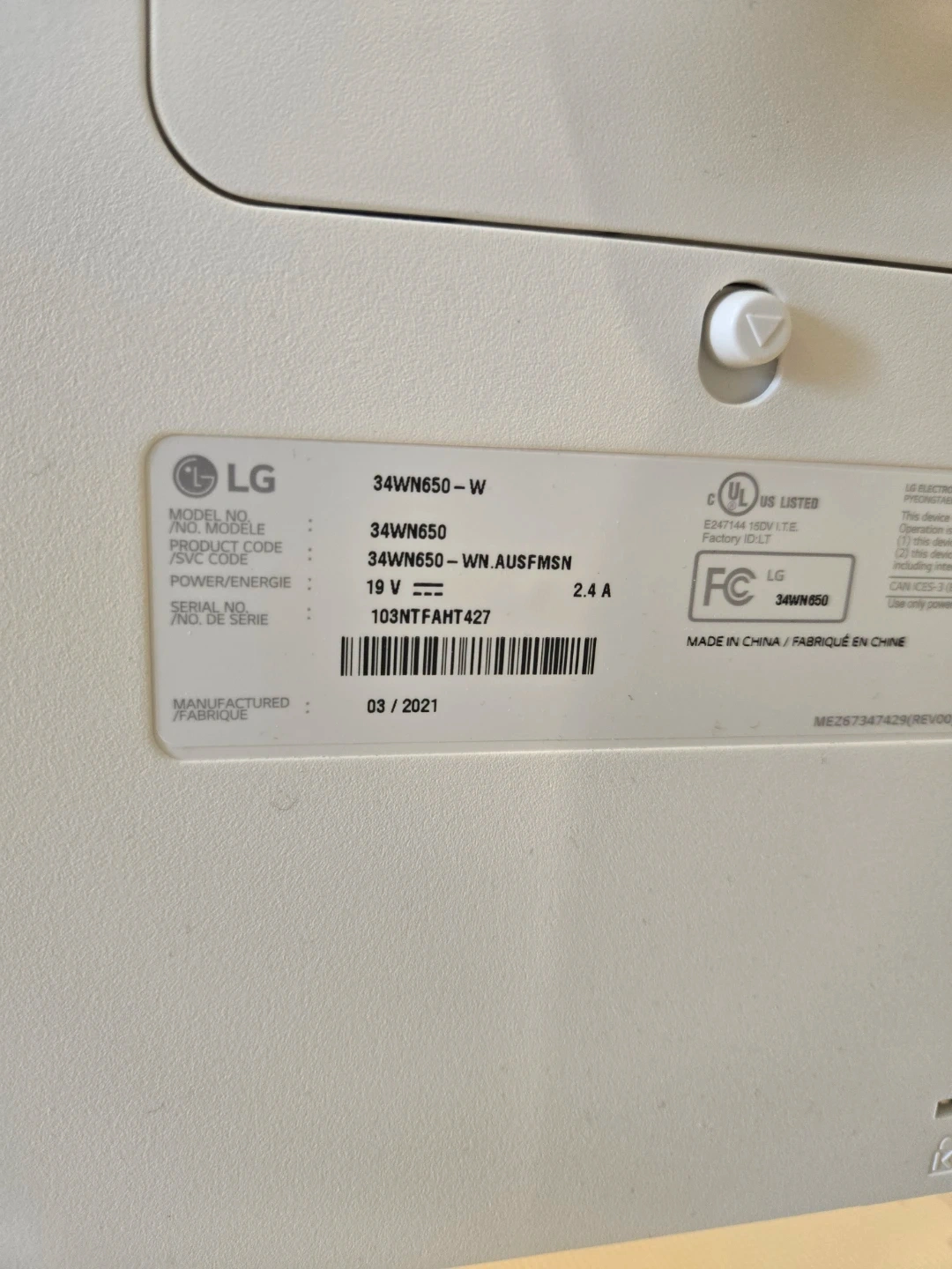 LG 34WN650-W monitor. Manufactured March 2021. It comes with DP-IN, HDMI 1, and HDMI 2 ports.
