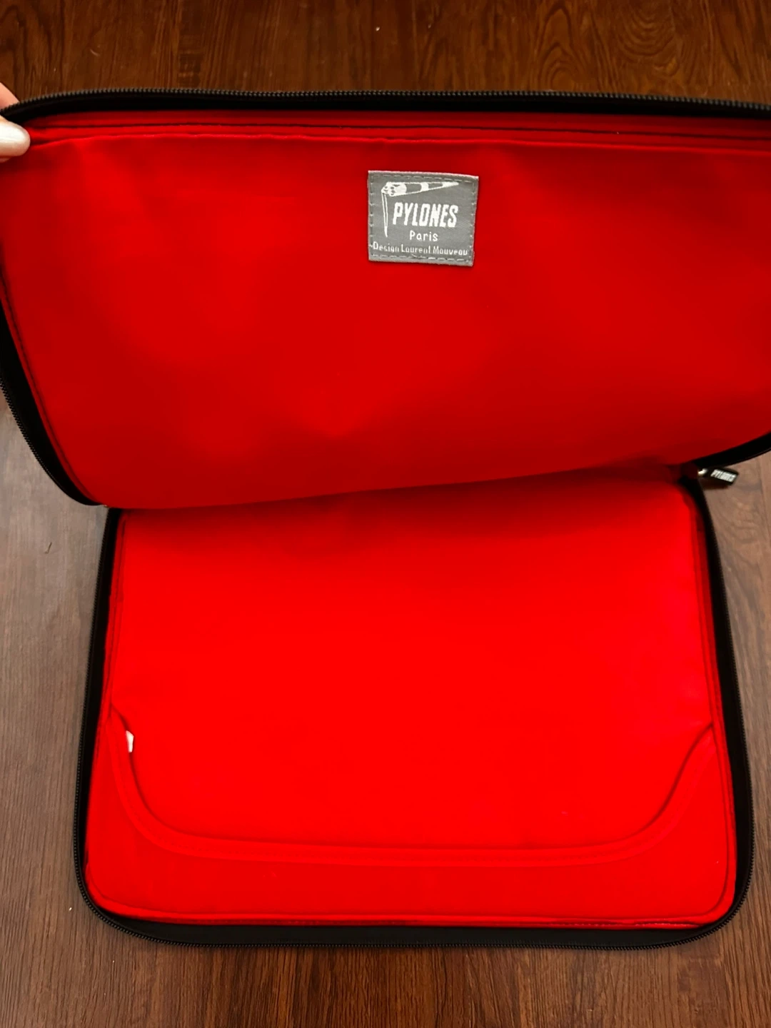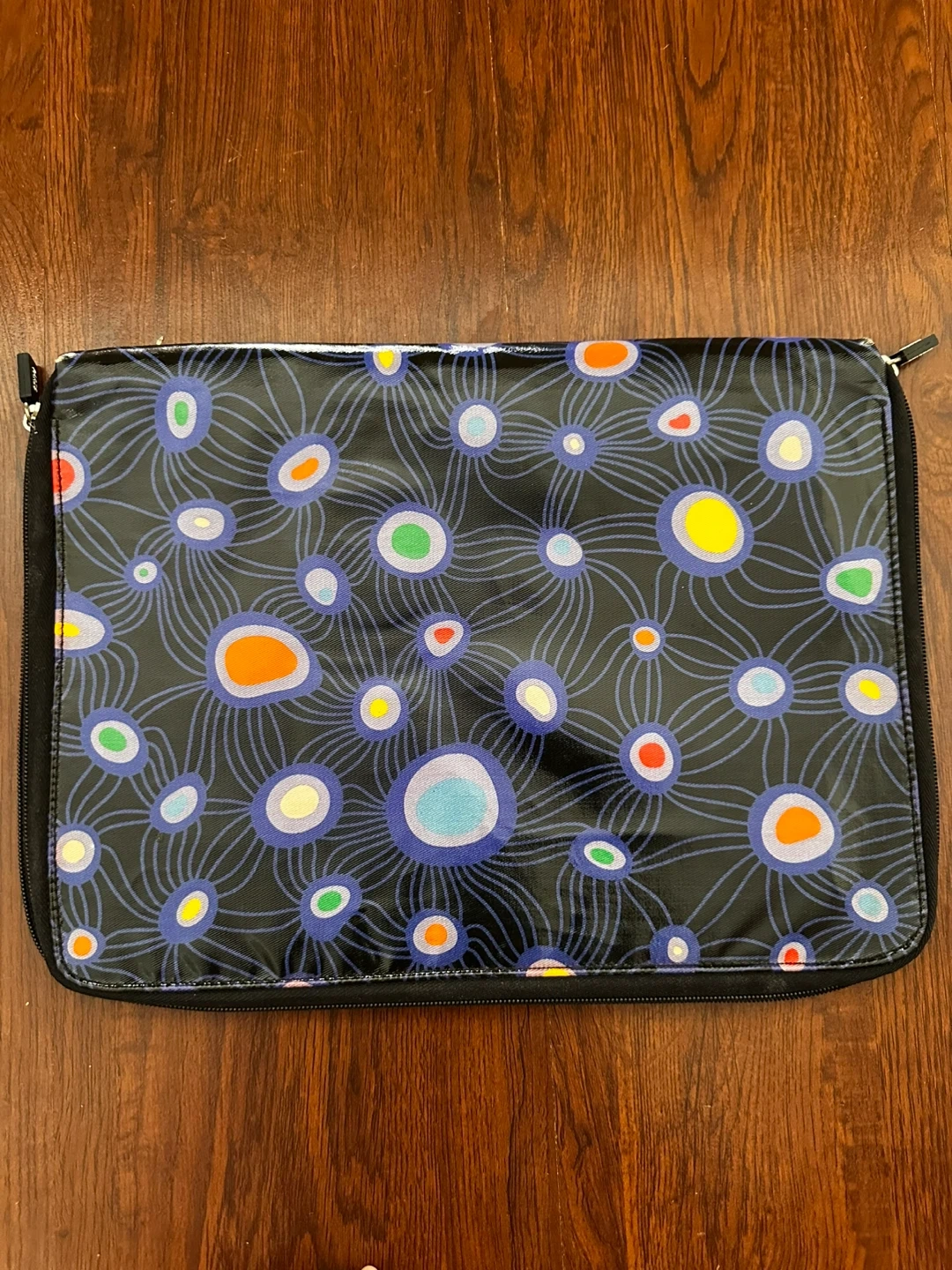 This Pylones Paris laptop sleeve offers vibrant protection for your electronics. It features a bright red interior lining and a unique, colourful patterned exterior. Zipper closure keeps your devices secure.