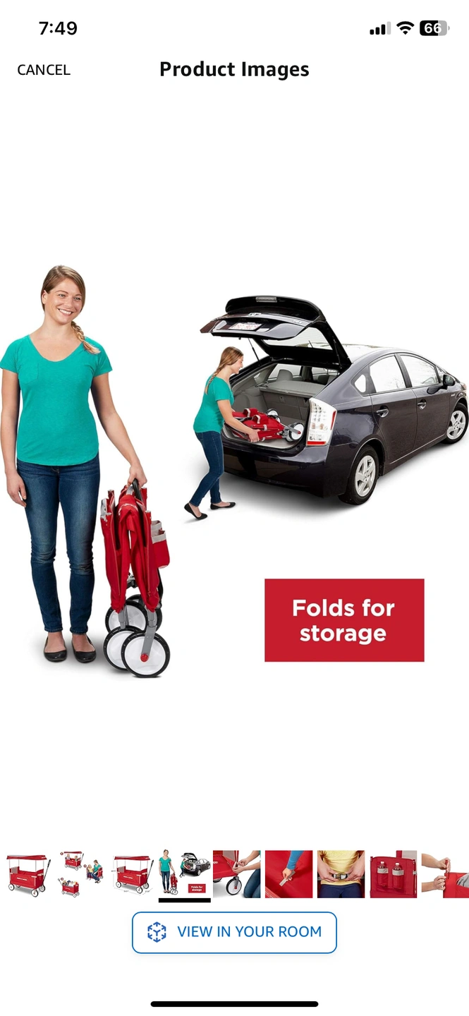 FOLDS FOR STORAGE: easy one hand fold allows convenient storage. Folded wagon dimensions: 7 L x 18.50 W x 32.68 H inches.