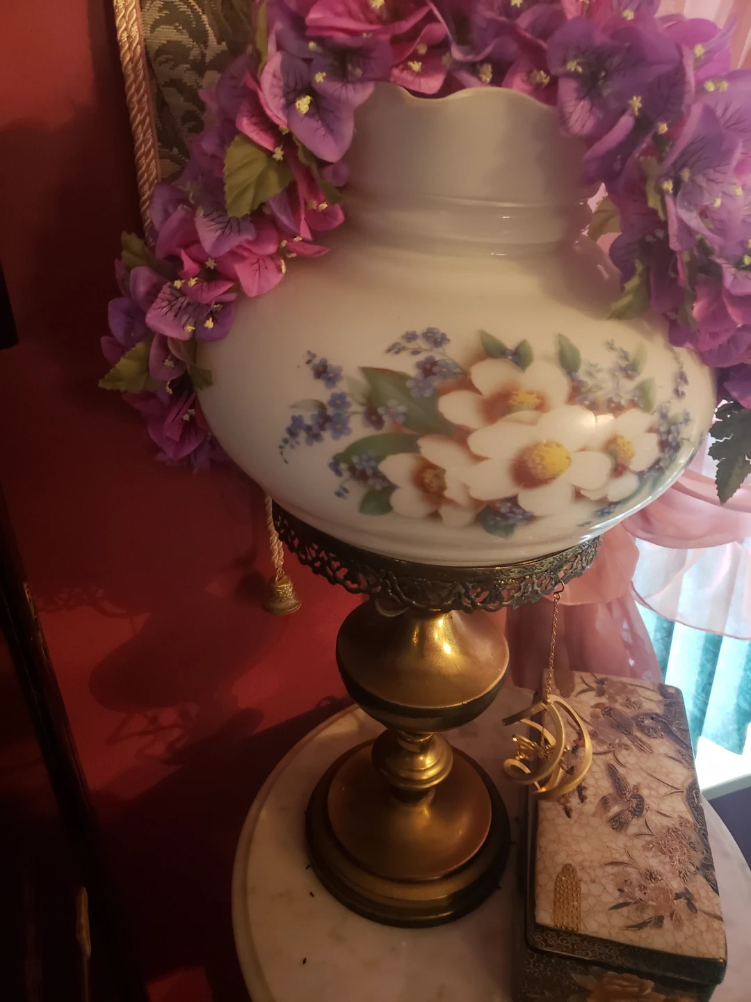 This is a vintage table lamp with a white glass shade featuring a delicate floral pattern. It has a decorative brass base and is adorned with artificial purple flowers. Adds a charming touch to any room!