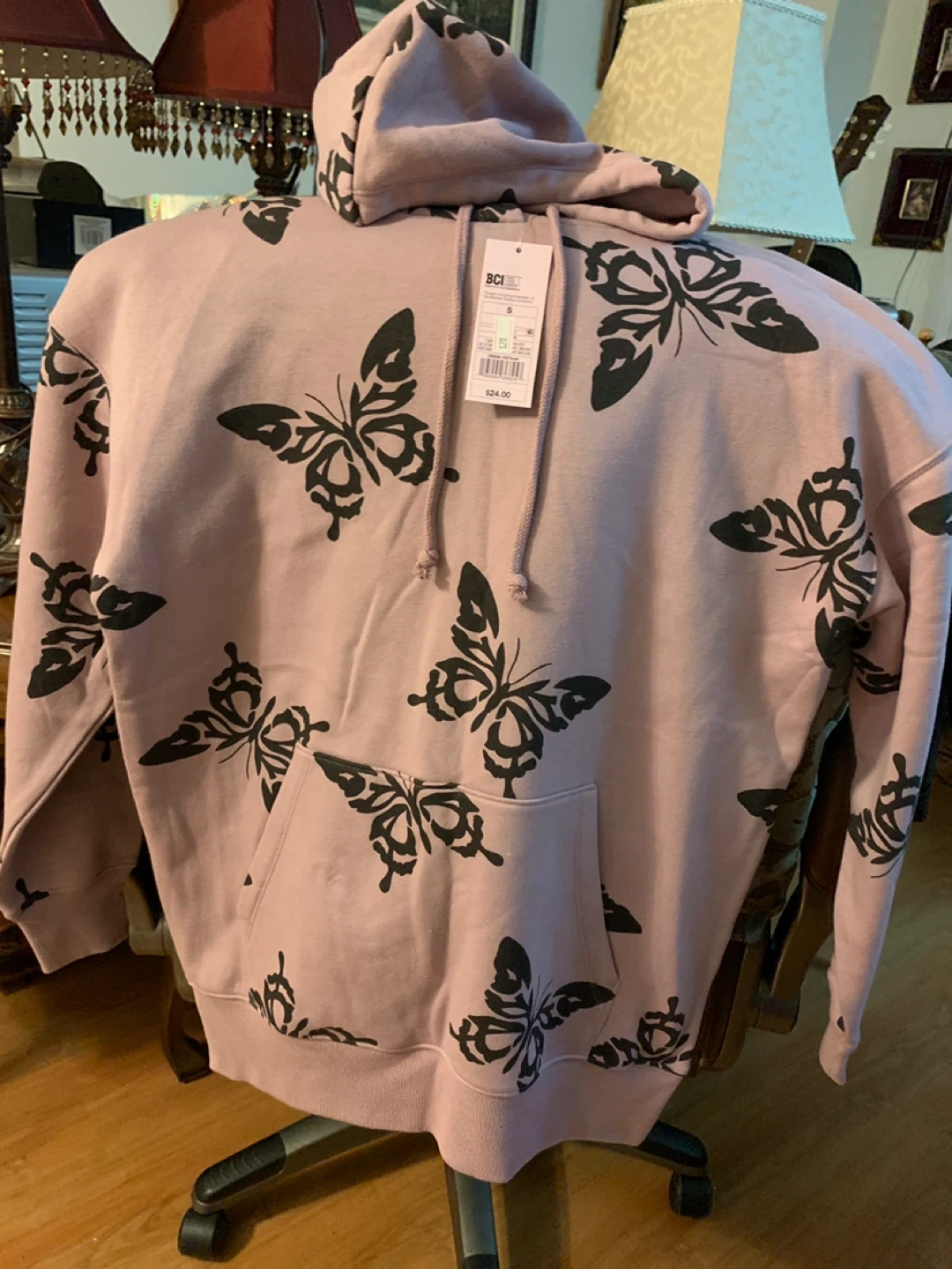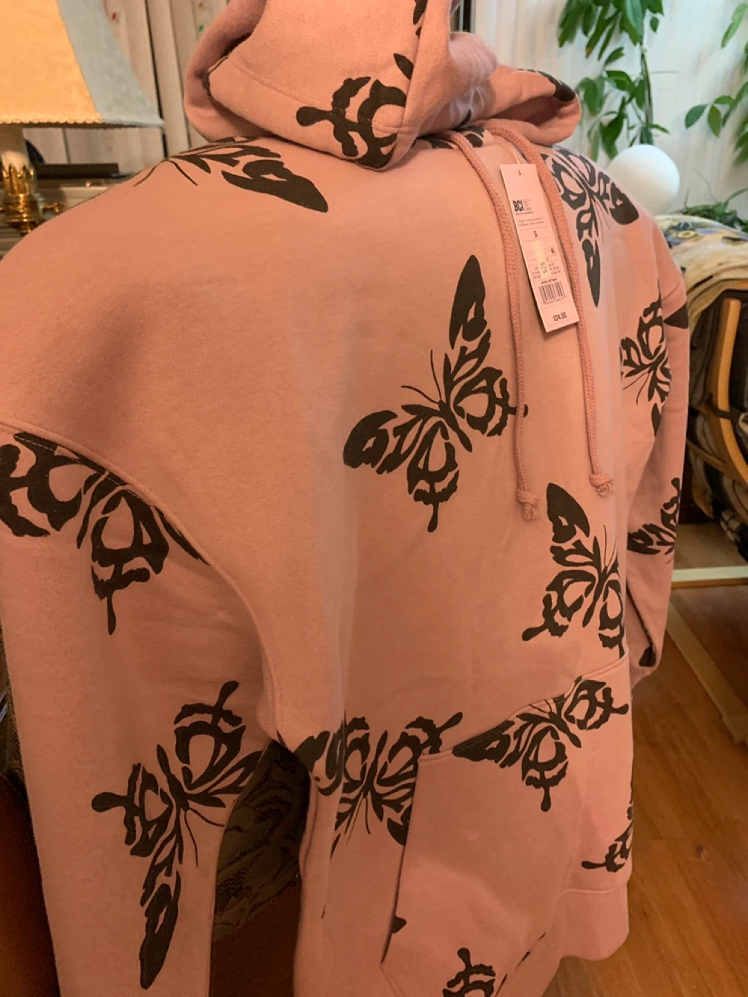 This is a hoodie featuring a butterfly print all over. It has a kangaroo pocket and a drawstring hood. Size is small.