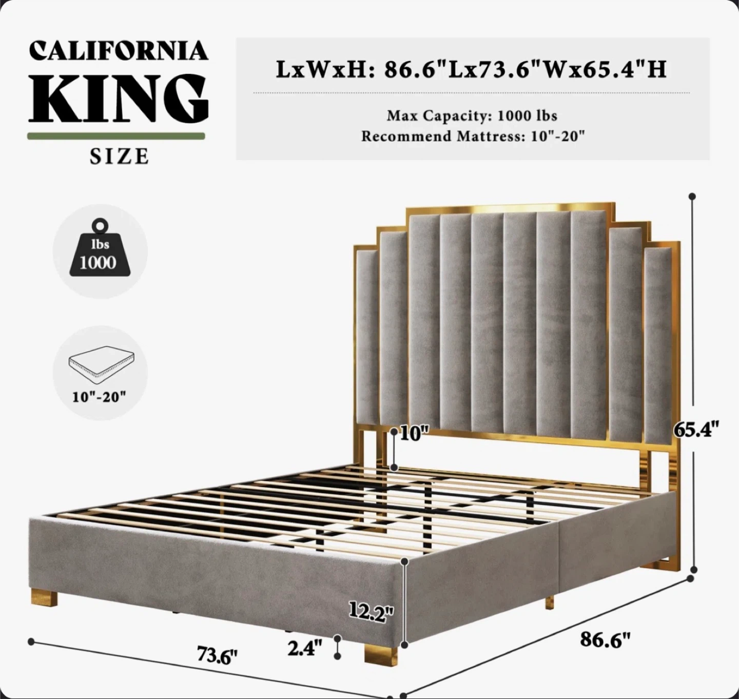 Stylish California King bed frame featuring plush grey velvet upholstery and elegant gold trim. Dimensions are 86.6" L x 73.6" W x 65.4" H. This bed frame supports up to 1000 lbs.It's a gorgeous centrepiece for any bedroom!
