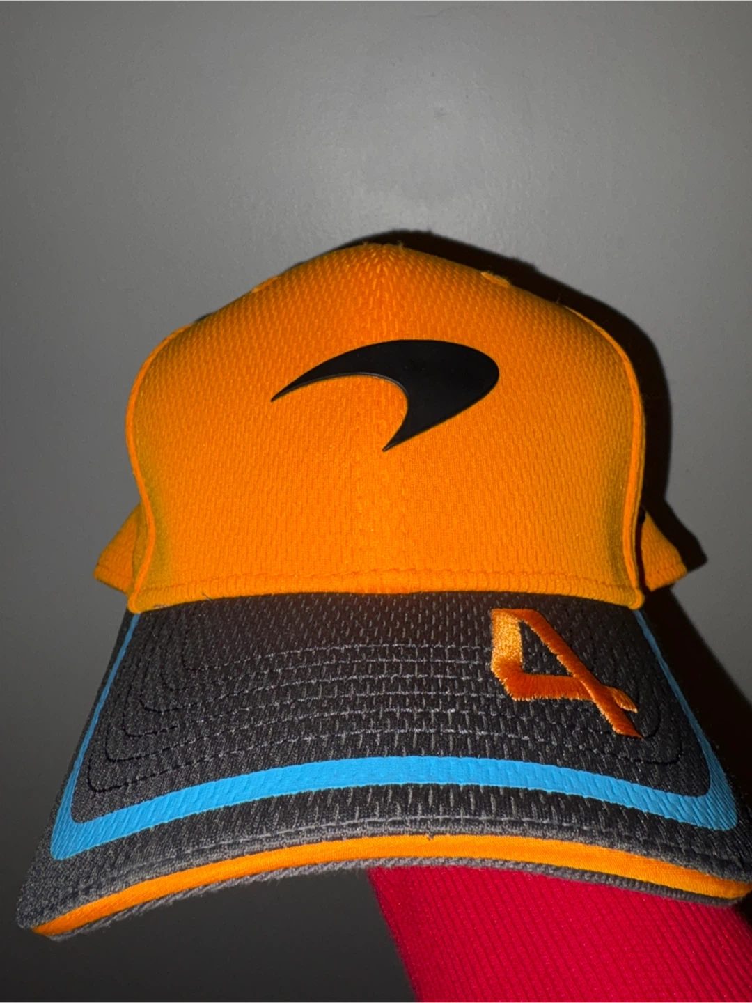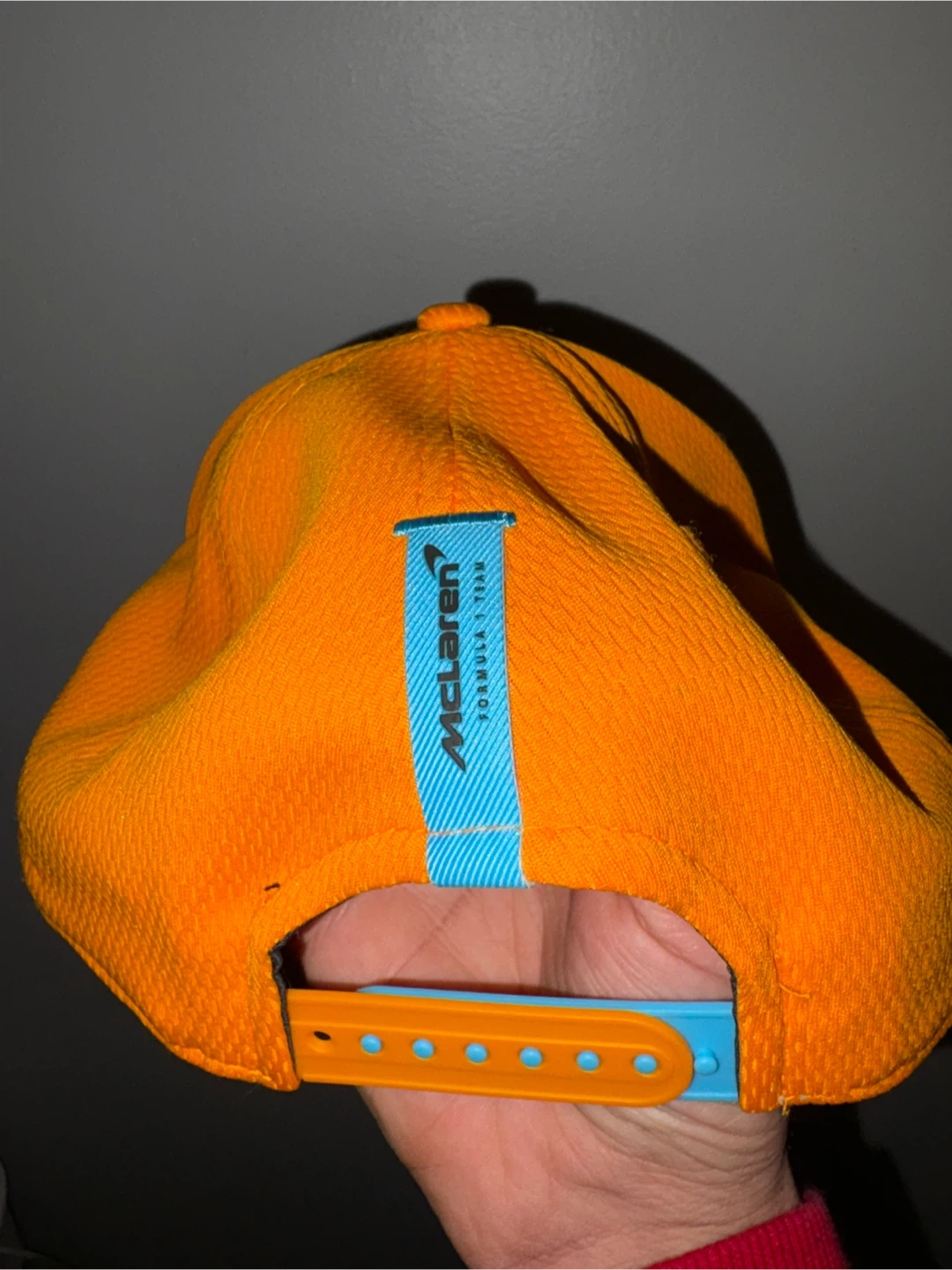 This is a McLaren Formula 1 team snapback hat. It's an adjustable medium-large size. It's orange with grey accents and the McLaren logo.