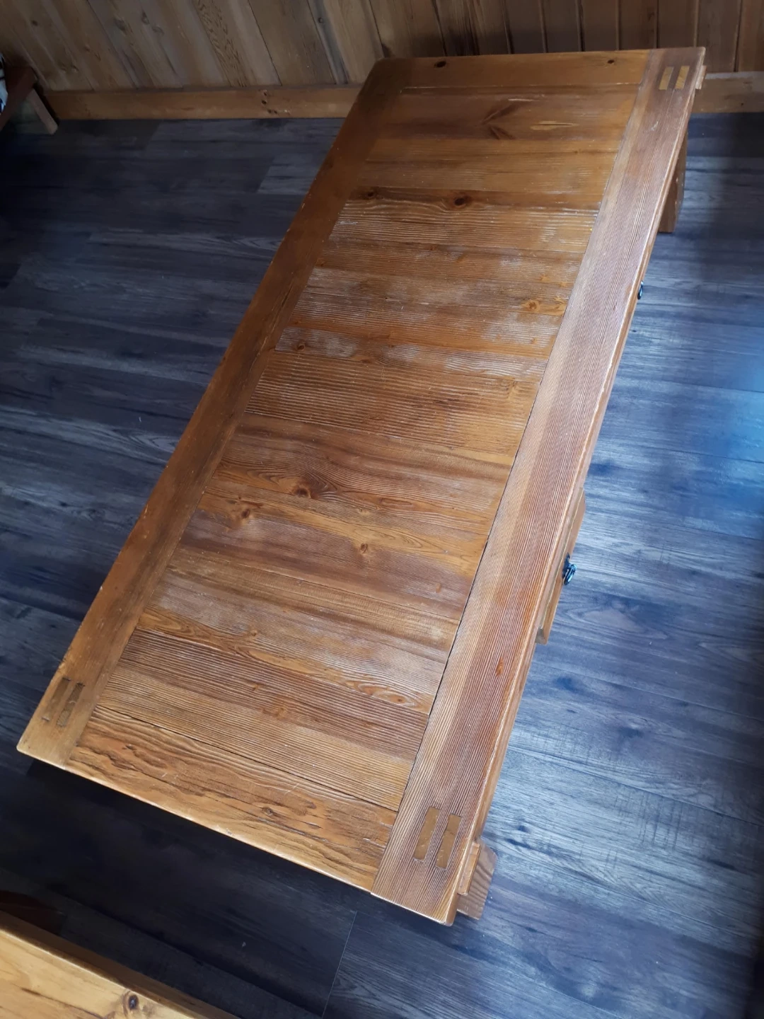 A lovely wooden coffee table. It has a rustic design with visible wood grain. Includes two drawers for storage. Solid wood construction.