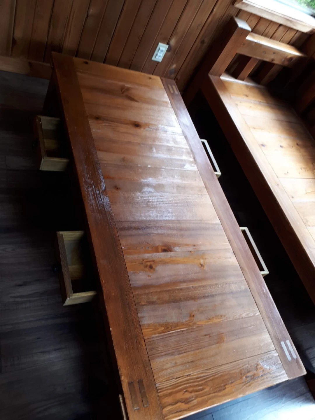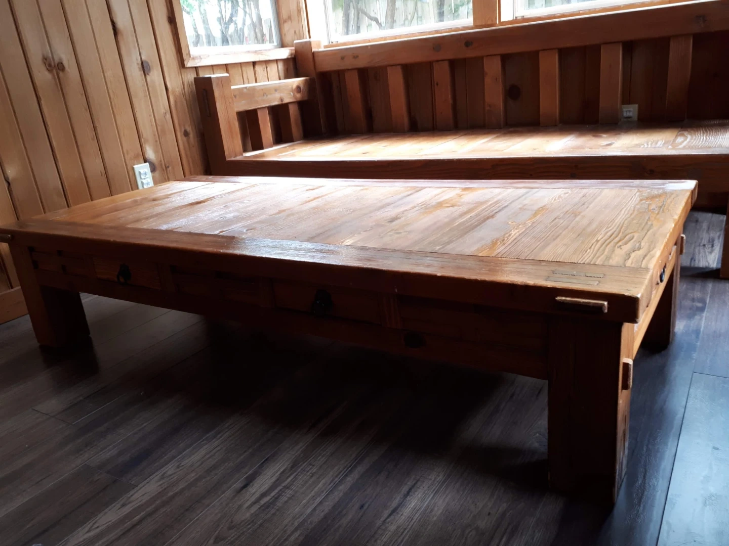 A lovely wooden coffee table. It has a rustic design with visible wood grain. Includes two drawers for storage. Solid wood construction.