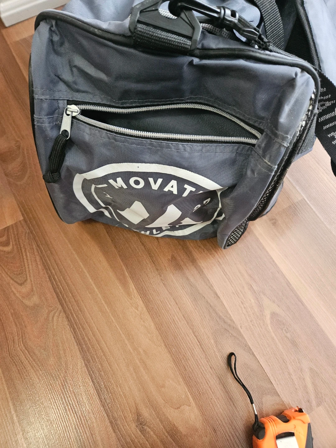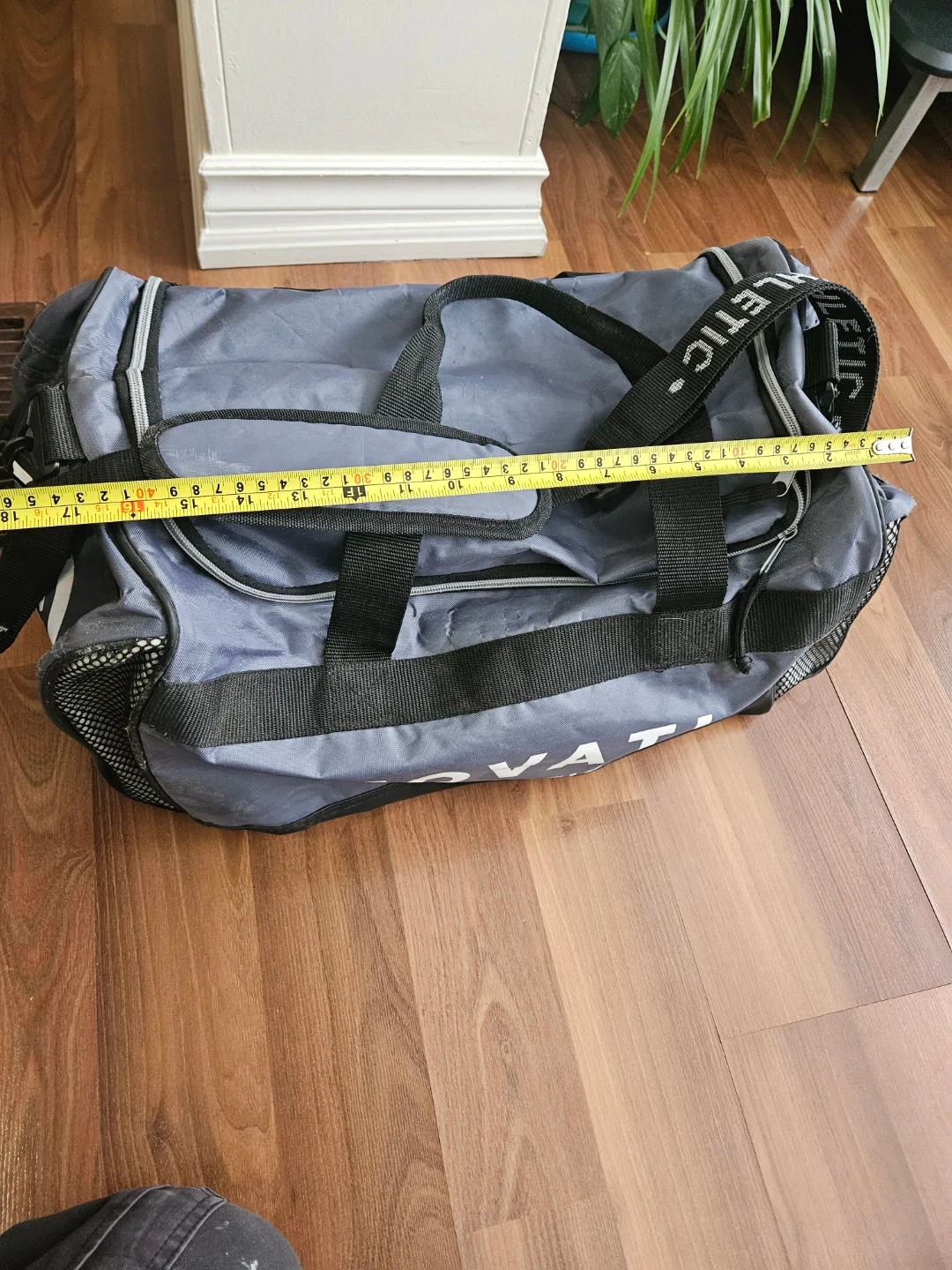 Grey duffel bag with black accents. It measures approximately 18 inches long. Features mesh side pockets and a front zippered compartment.