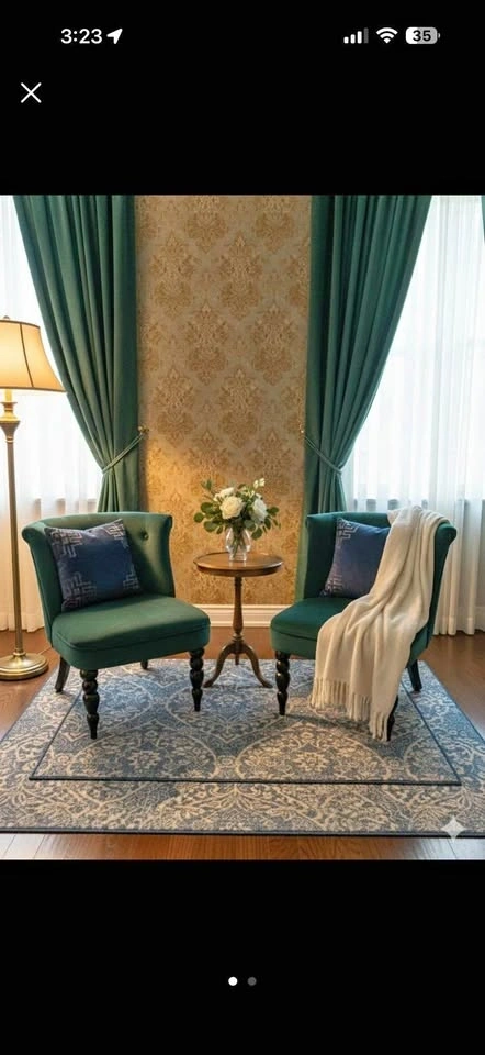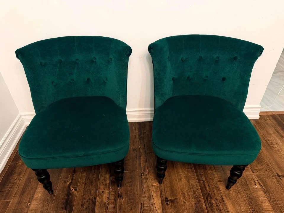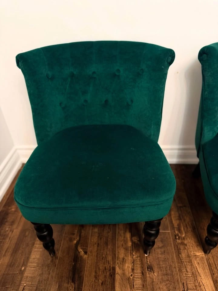 Excellent condition! Good size for small or large living spaces. Velvet accent chairs come in a deep emerald green color. Each chair has a button-tufted backrest and dark espresso-finished turned wood legs. Fabric is soft to the touch and chairs have a sturdy wooden frame.