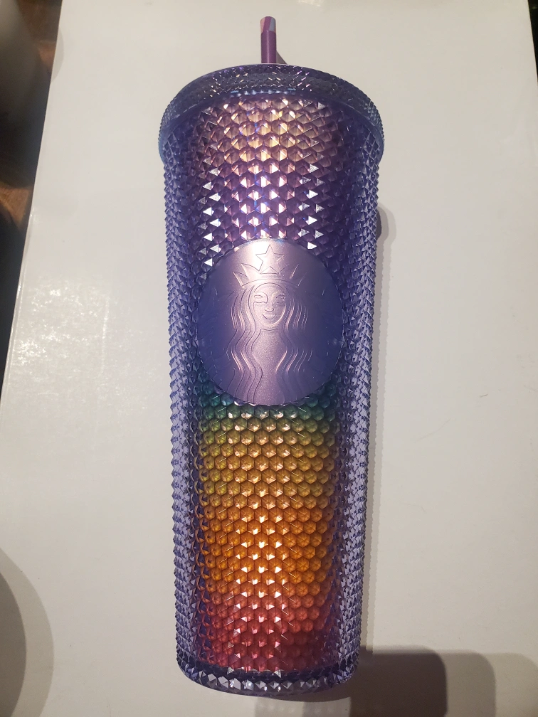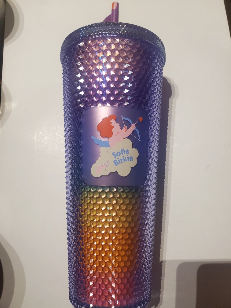 A Starbucks cold cup with a rainbow design. The cup is purple with a diamond-like pattern. It has a clear lid and a matching straw. It has a sticker of the Starbucks logo with a crown and a sticker with the name "Sophie Birkin" and an image of a cherub holding an arrow. The cup has never been used and it's brand new.