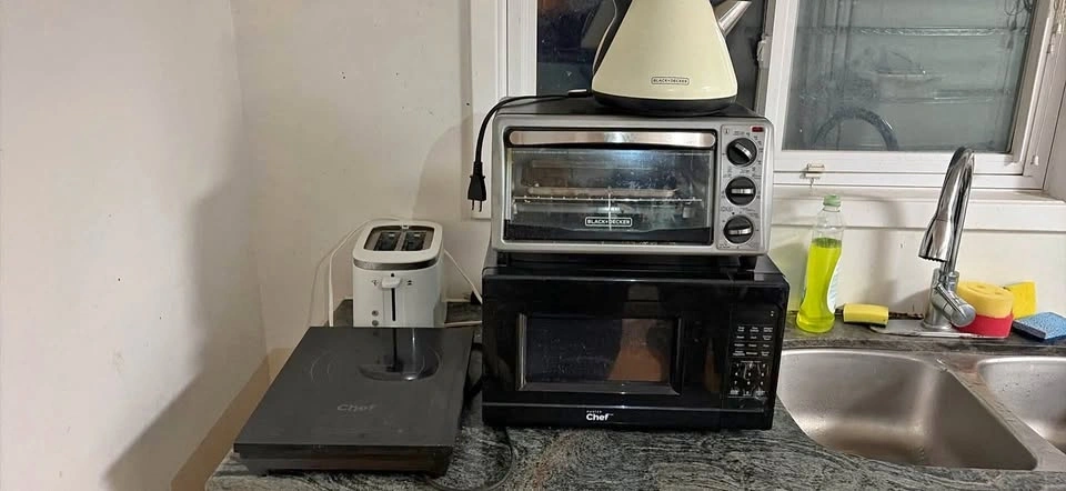 Functional kitchen appliance set includes Master Chef microwave, Black + Decker toaster oven, Black + Decker electric kettle, Master Chef induction burner, and white two-slice toaster. Microwave is black with digital display. Toaster oven is silver and black with dial controls. Kettle is cream colored with black base. Induction cooktop is black glass. All items are used with standard wear.