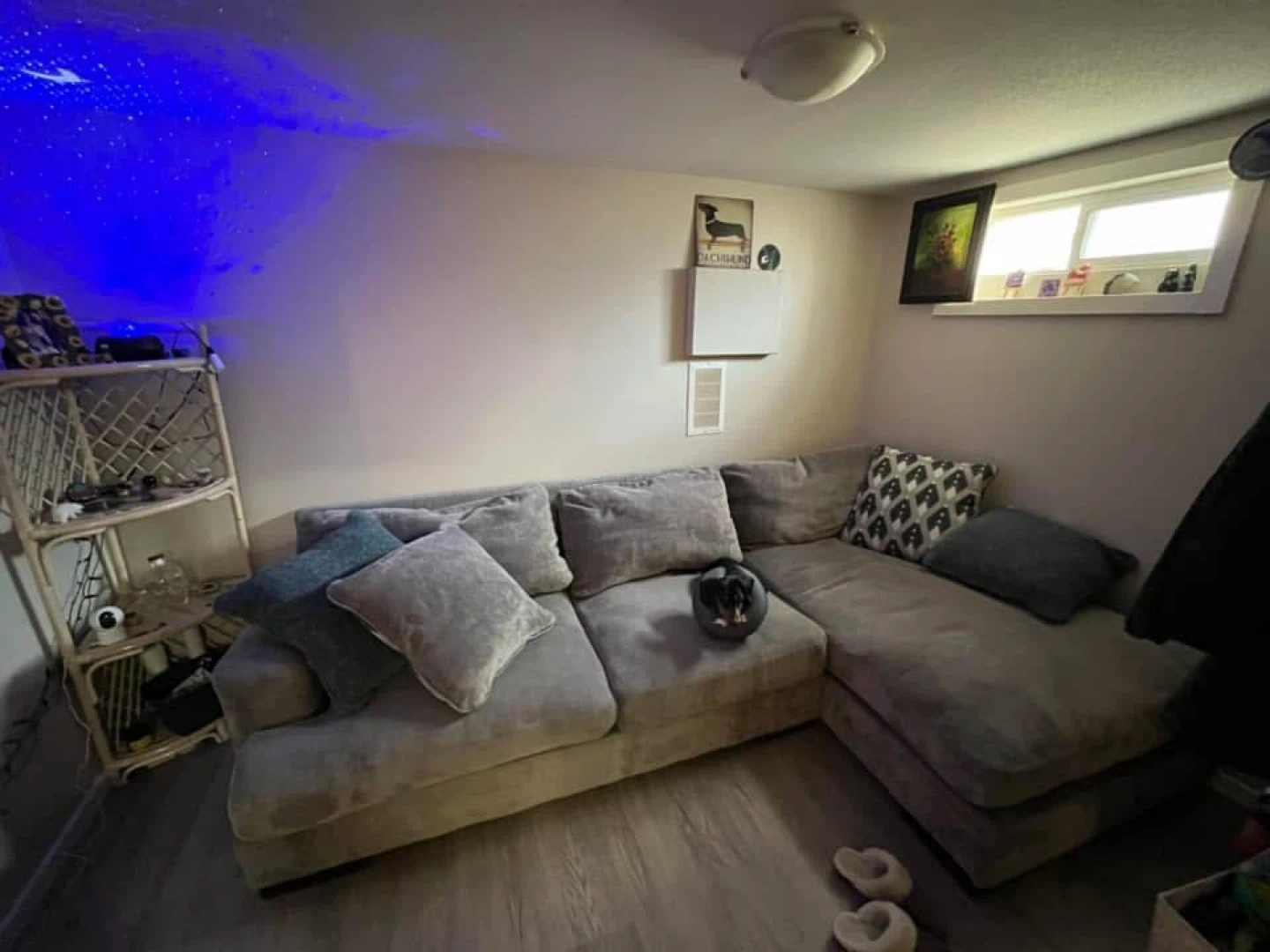 Comfortable L-shaped sectional sofa in a neutral grey. It's upholstered in a soft, textured fabric with deep, plush cushions. Comes with an assortment of throw pillows for added comfort and style. Perfect for a living room or den!