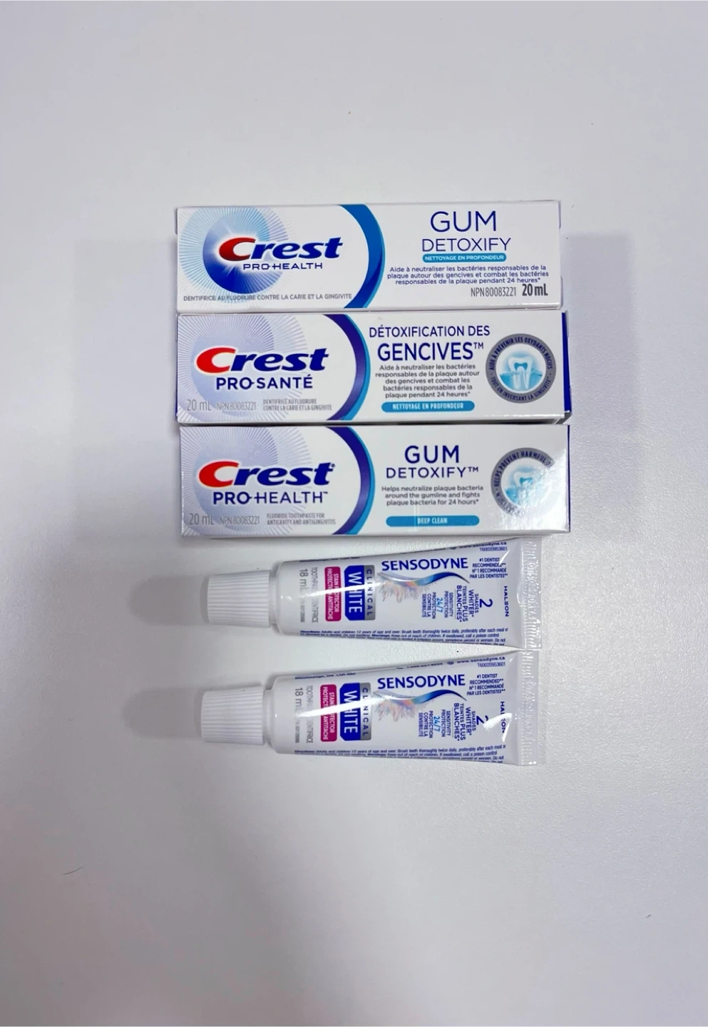 All new unopened.Includes three Crest Gum Detoxify toothpastes (2 x 20mL, 1 x 20mL Pro-Santé) and two Sensodyne Clinical White toothpastes (18mL each).