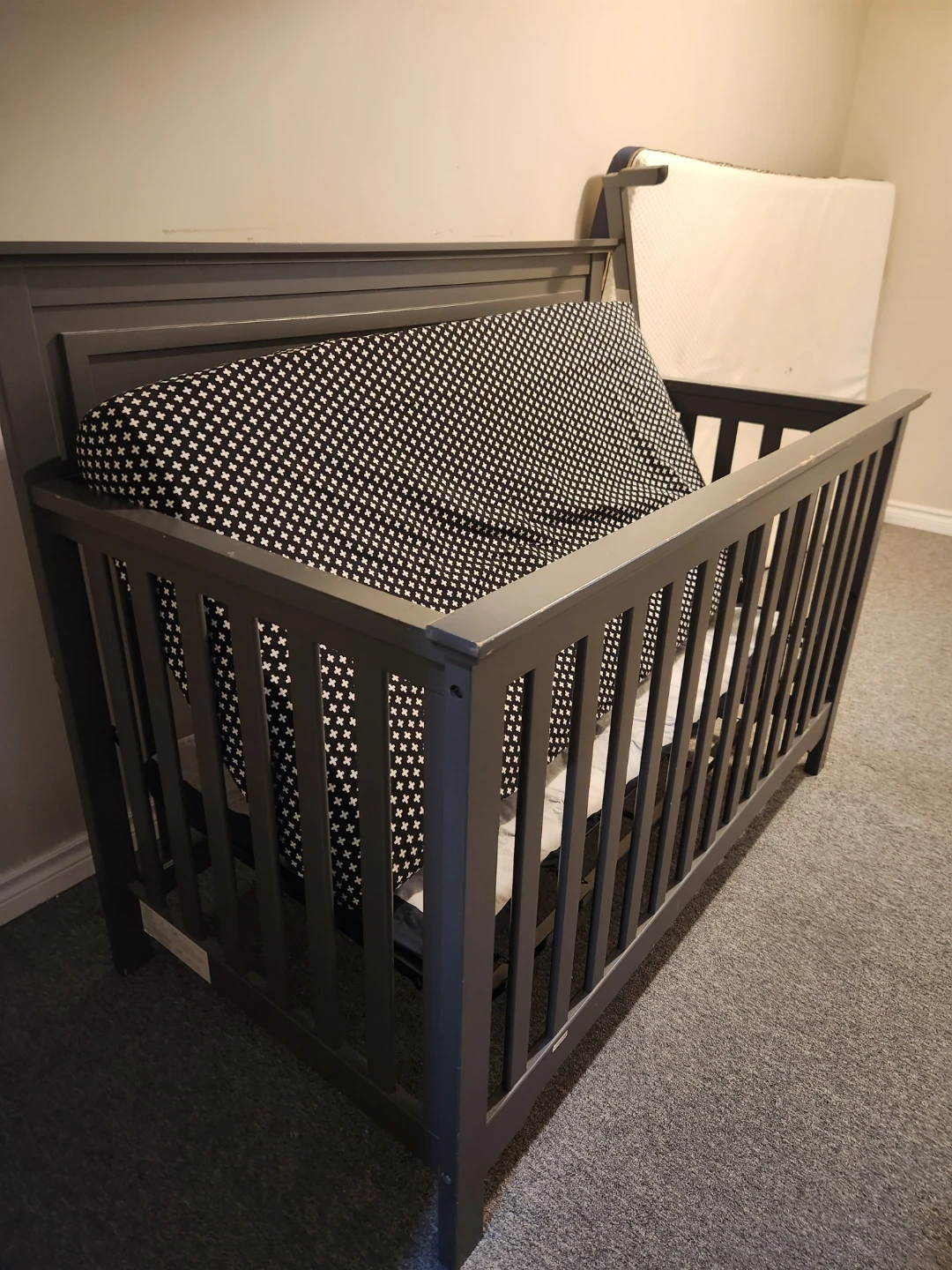 This is a grey convertible crib. It's in good condition and comes with a mattress. The crib can be converted to a toddler bed.
