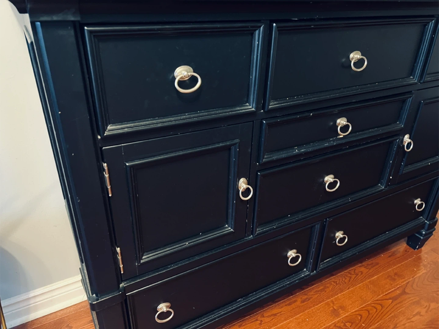 This black dresser offers ample storage with multiple drawers and cabinet space. It's ideal for organizing bedroom essentials. The classic design complements various decor styles.