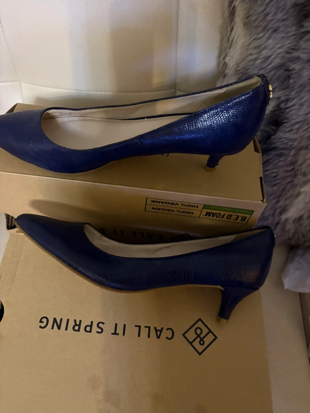 These are navy blue Call It Spring pumps. They have a textured finish and a small heel. They're made of vegan leather.