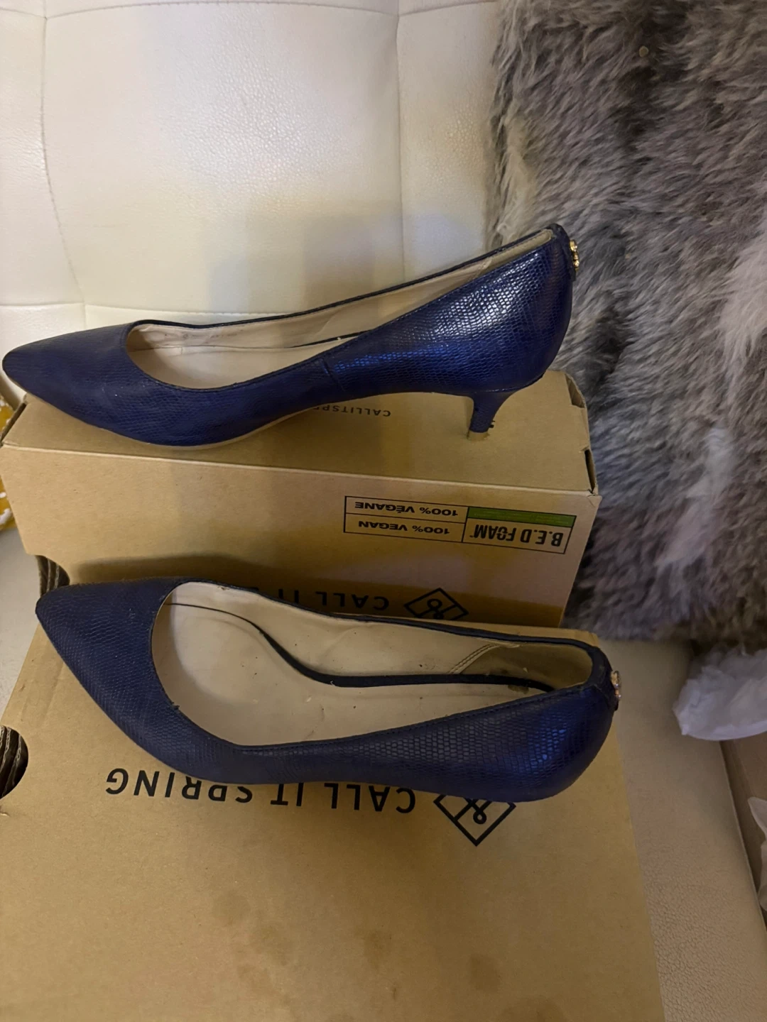 These are navy blue Call It Spring pumps. They have a textured finish and a small heel. They're made of vegan leather.