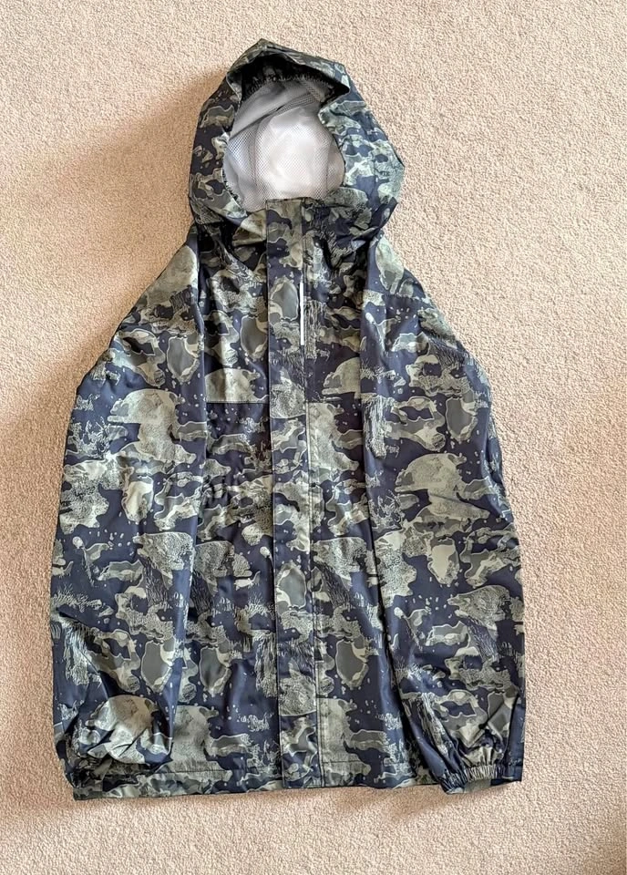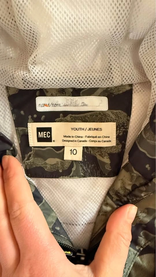 Cool MEC youth jacket. Size 10. Has dark and green camo-like pattern. Hooded design. Zipper closure. Mesh lining inside. Great for outdoor adventures.