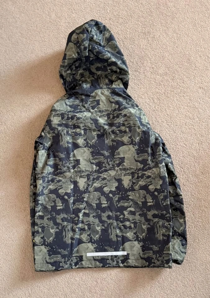 Cool MEC youth jacket. Size 10. Has dark and green camo-like pattern. Hooded design. Zipper closure. Mesh lining inside. Great for outdoor adventures.
