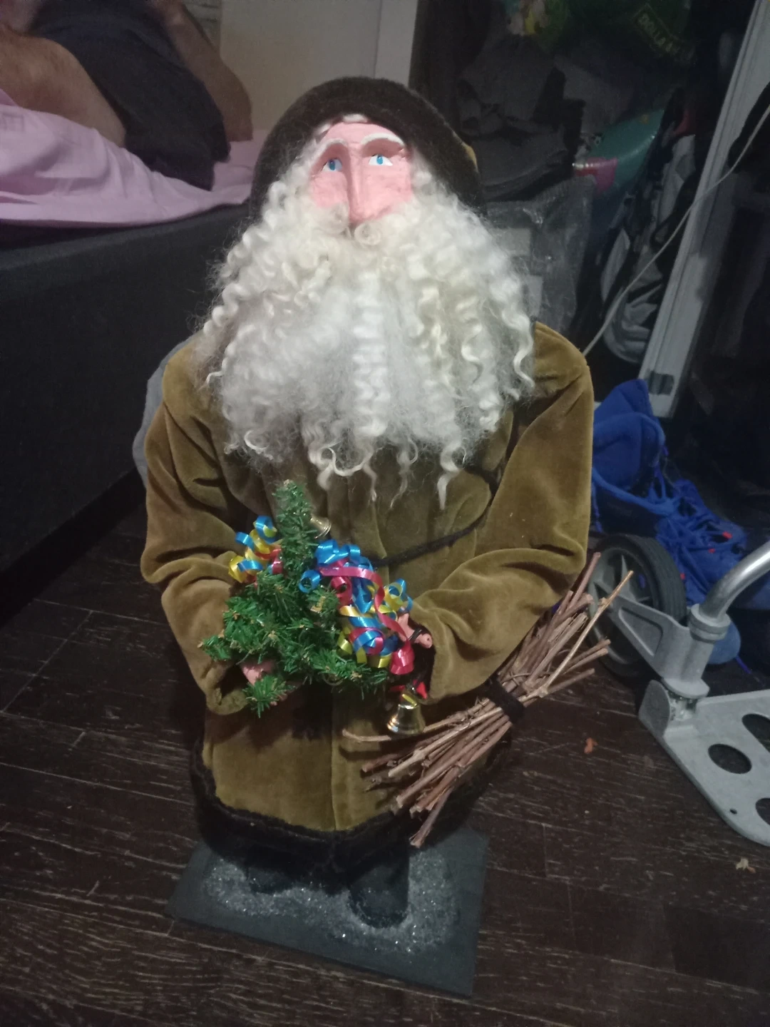 This is a decorative Santa Claus figure. It's wearing a brown robe and hat with a faux fur trim. The figure is holding a small artificial Christmas tree with colourful ribbons and a bundle of twigs with a small bell. It's mounted on a grey base.