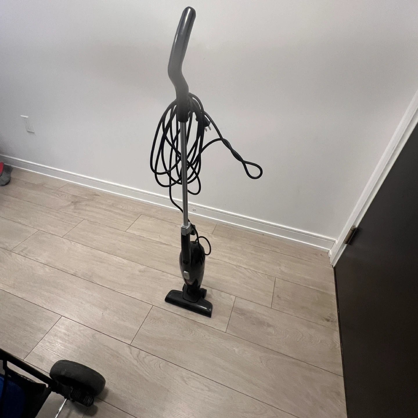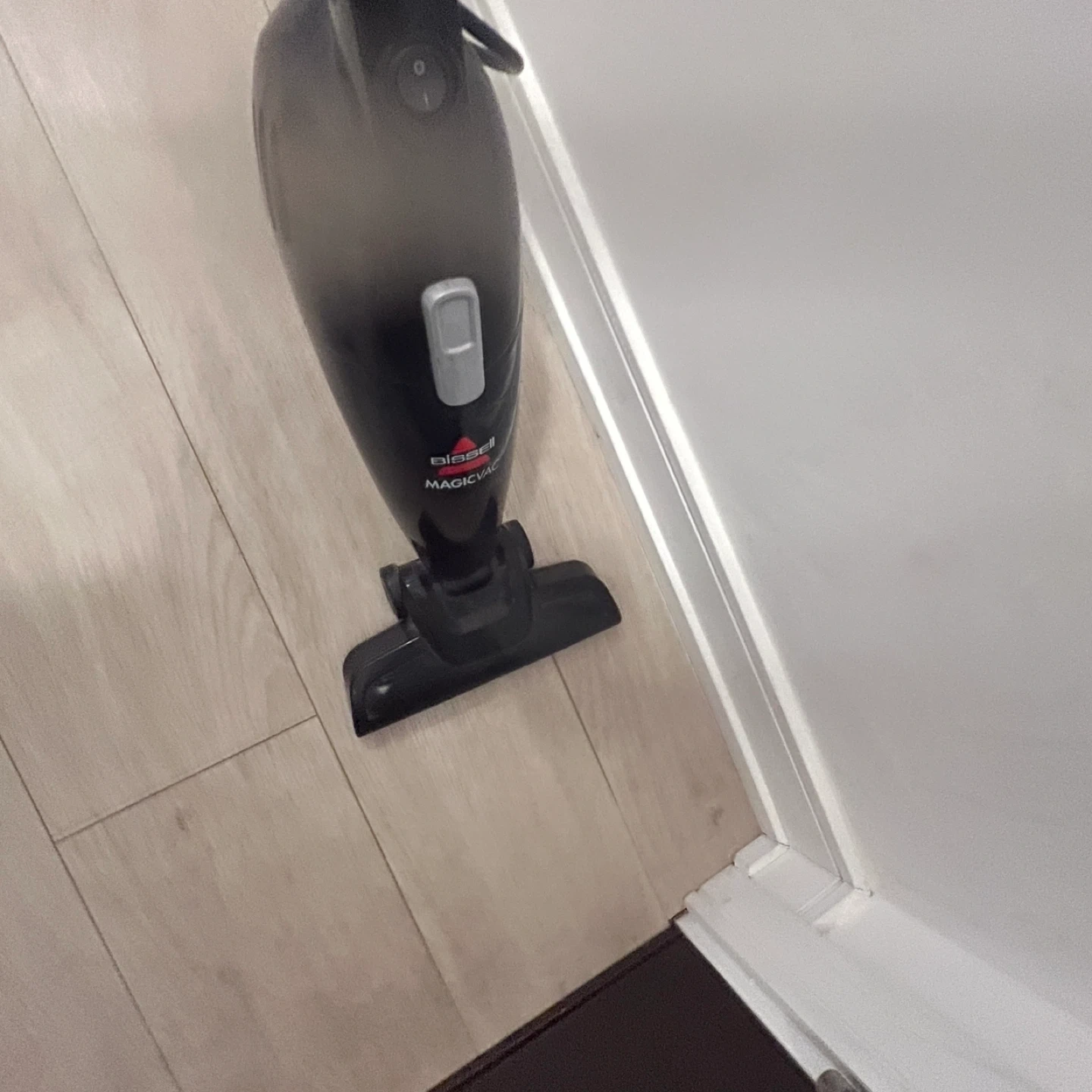 Lightweight Bissell Magic Vac stick vacuum. Black with silver accents. Corded electric vacuum cleaner.