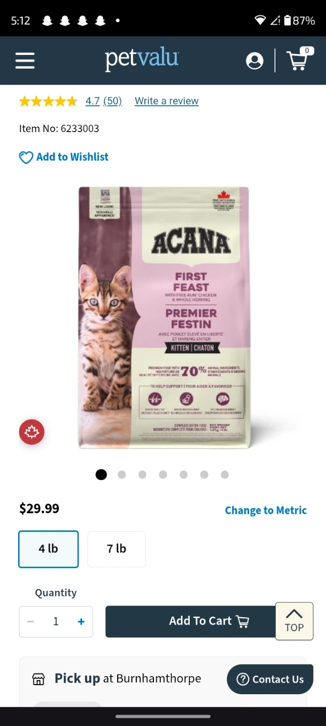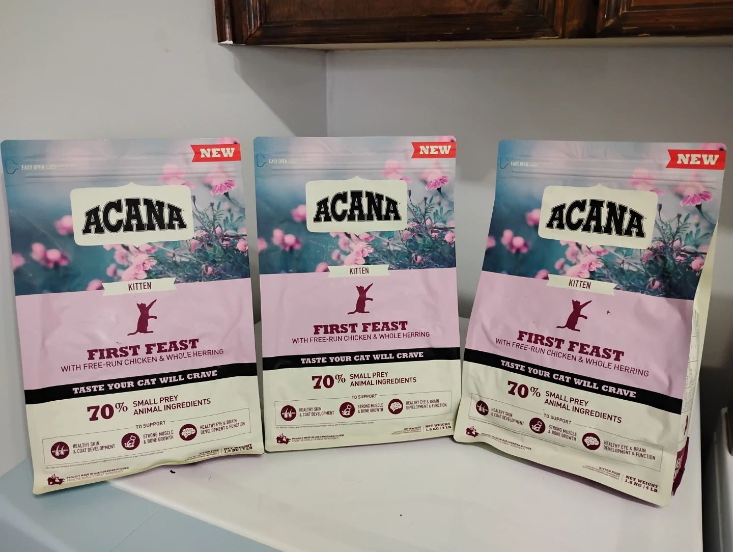I have 3 unopened brand new 4lbs bags of ACANA kitten first feast with run free chicken and whole herring food.