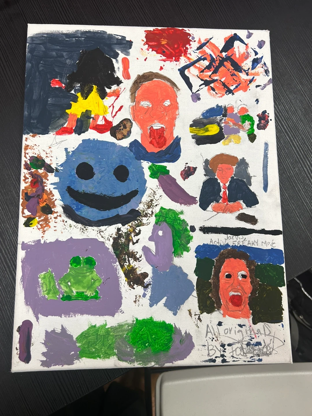 This is an original mixed media painting on canvas. It features a collage of various painted figures and abstract elements. The artwork is signed by the artist "fatcow" at the bottom right. It's ready to hang and would make a unique addition to your collection!