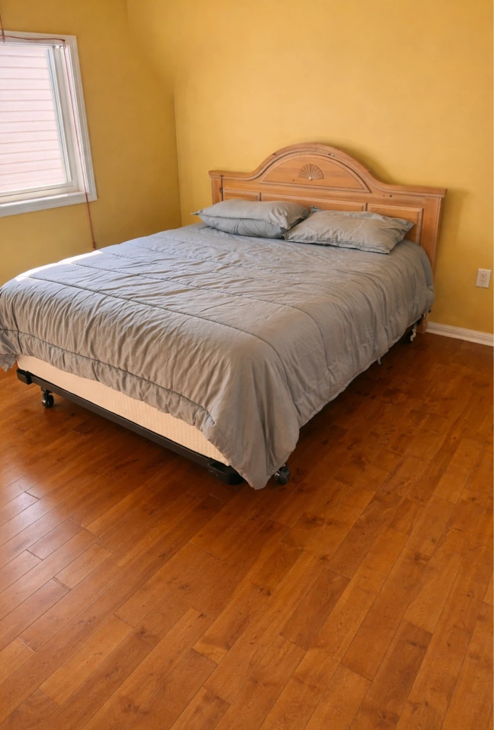 Queen bed frame with an elegant light wood headboard and a metal support system. Includes a standard queen size box spring. Solid, well-maintained condition!