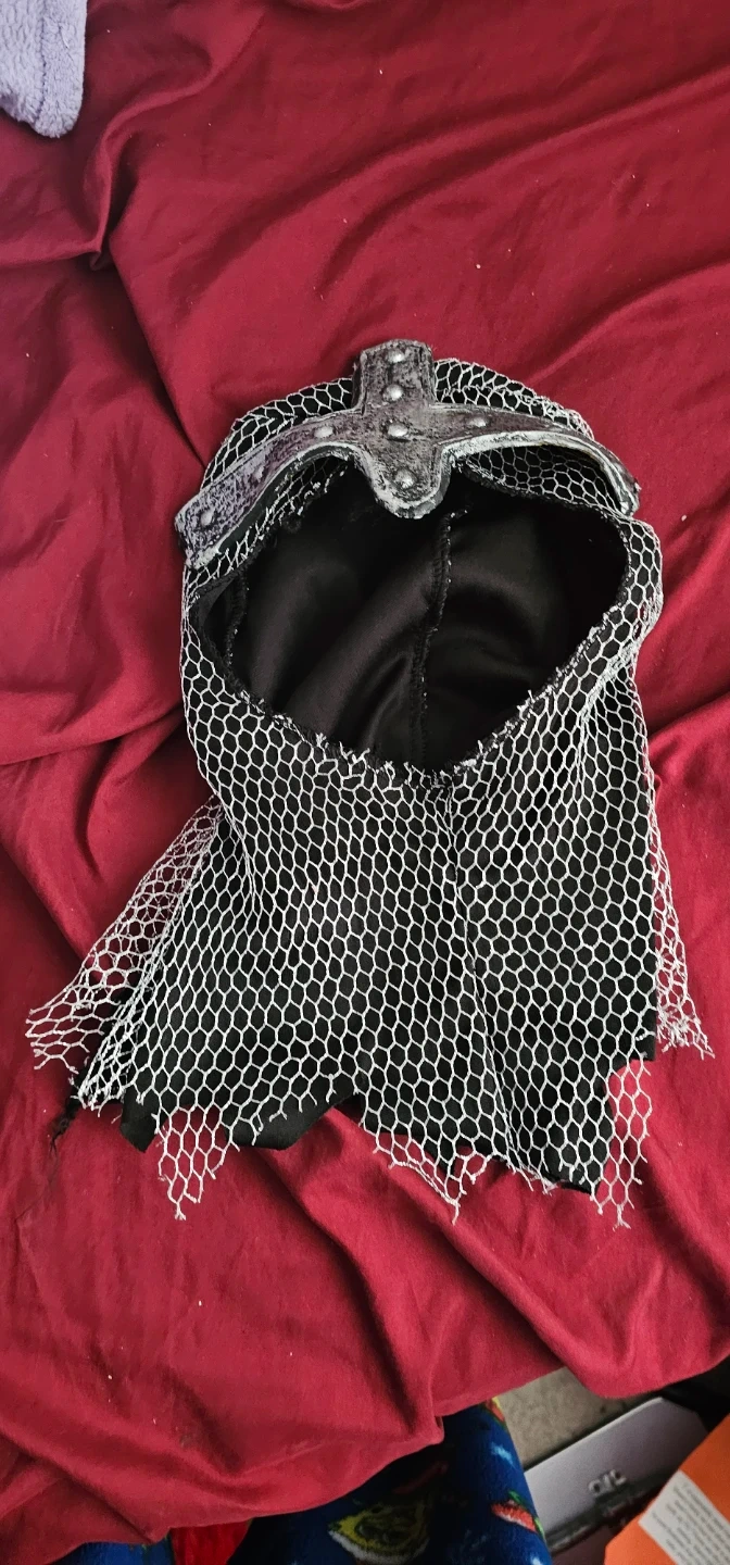 This is a chainmail hood costume accessory. It has a black fabric lining and a decorative metal band across the forehead with silver studs. The chainmail covers the head and neck, extending down to simulate armour.