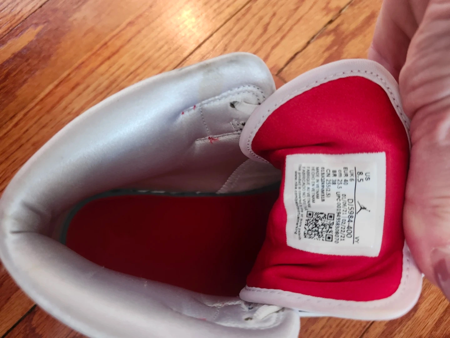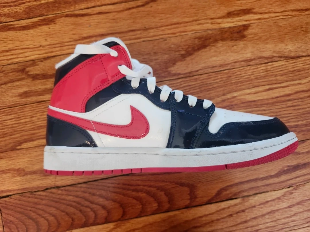 These Air Jordan 1 High OG sneakers come in a classic white, red, and navy colourway. They feature the iconic Jumpman logo and "AIR" branding on the tongue. Leather and synthetic materials. Size 8.5