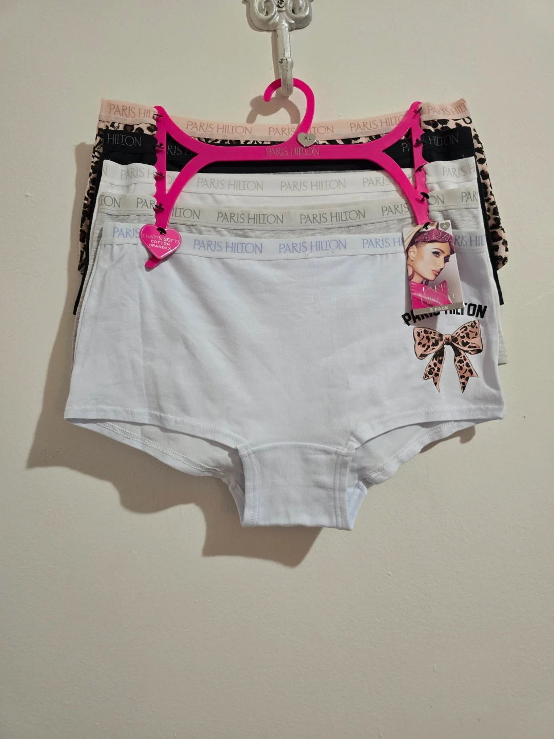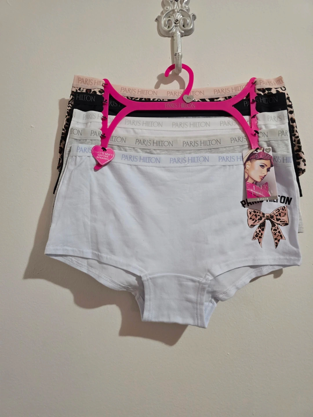 Brand new with tags (NWT). A stylish and soft 5-pack of authentic Paris Hilton panties in size XL. Made with high-quality, breathable cotton for ultimate comfort. This set features a chic variety of colors and a trendy animal print. ​Brand: Paris Hilton. ​Size: XL. ​Quantity: 5-Pack. ​Colors: Light Blue, Grey, White, Black, and a stylish Cheetah Print. ​Material: Soft Cotton Blend. ​Condition: Brand New with Tags (NWT).