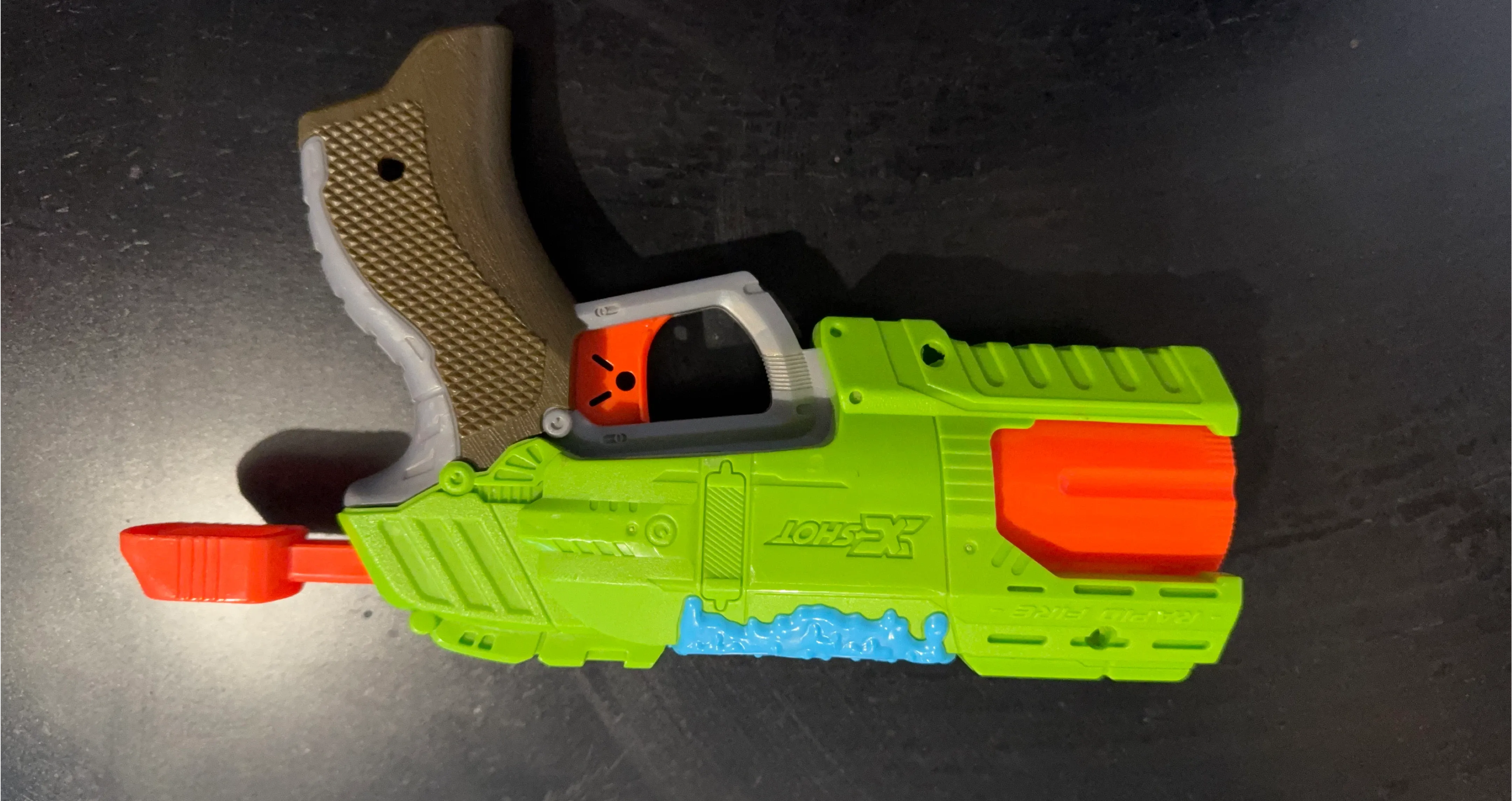 Selling an X-Shot Rapid Fire dart gun! It's in great shape and ready for some fun. Features a green, orange, and grey design. Perfect for kids and adults alike