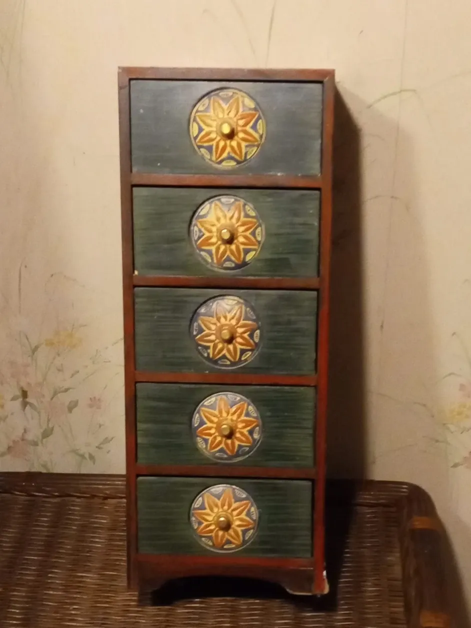 This decorative wooden chest features five green drawers, each with a unique floral medallion pull. It's great for storing small items like jewelry or craft supplies. The dark red wood frame adds a nice contrast to the green drawers.