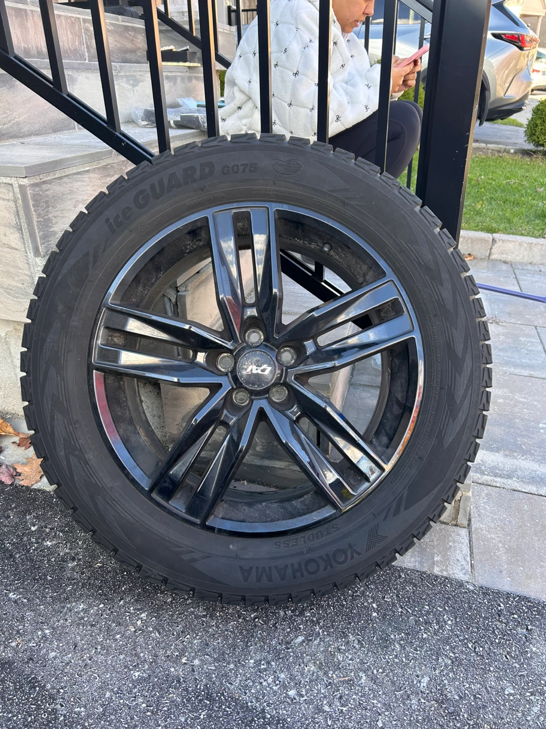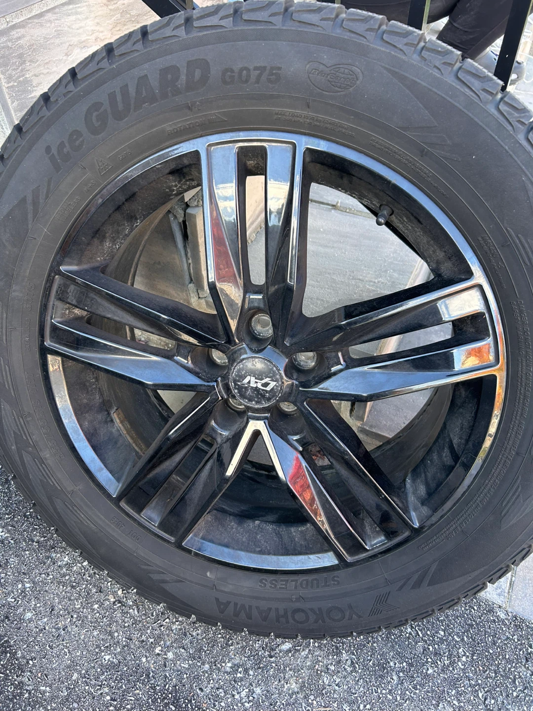 Selling a Yokohama Ice Guard G075 winter tire mounted on a stylish black alloy rim. The tire is in good condition and ready for the winter season!