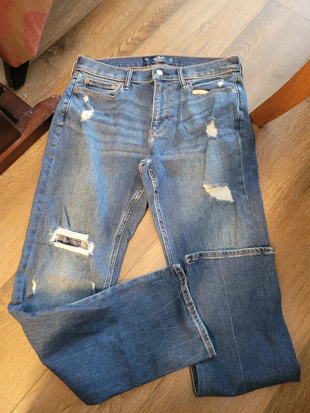These are Hollister jeans in a men's size 34 waist and 32 inseam. They're a distressed blue denim style with rips and wear. Great for casual wear!