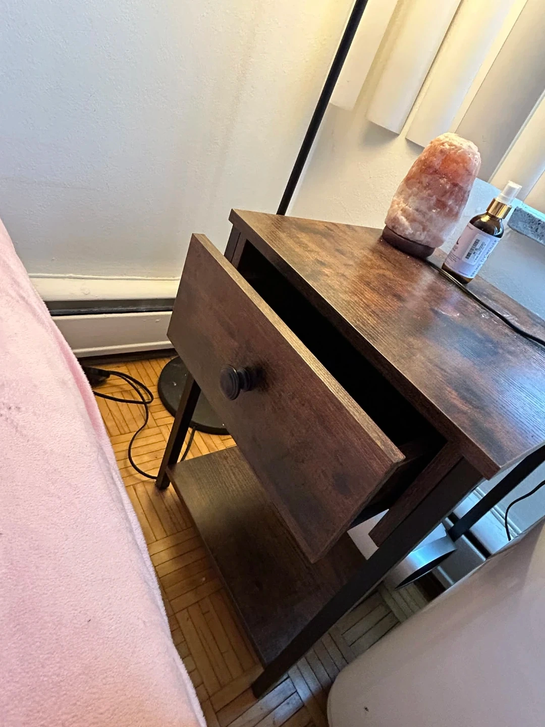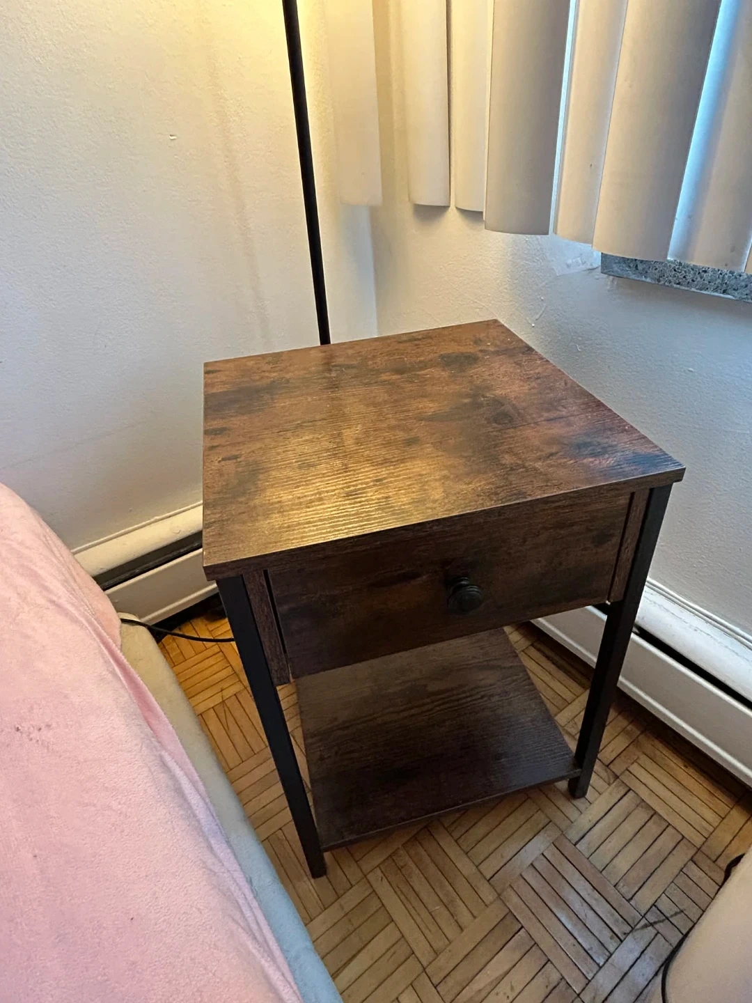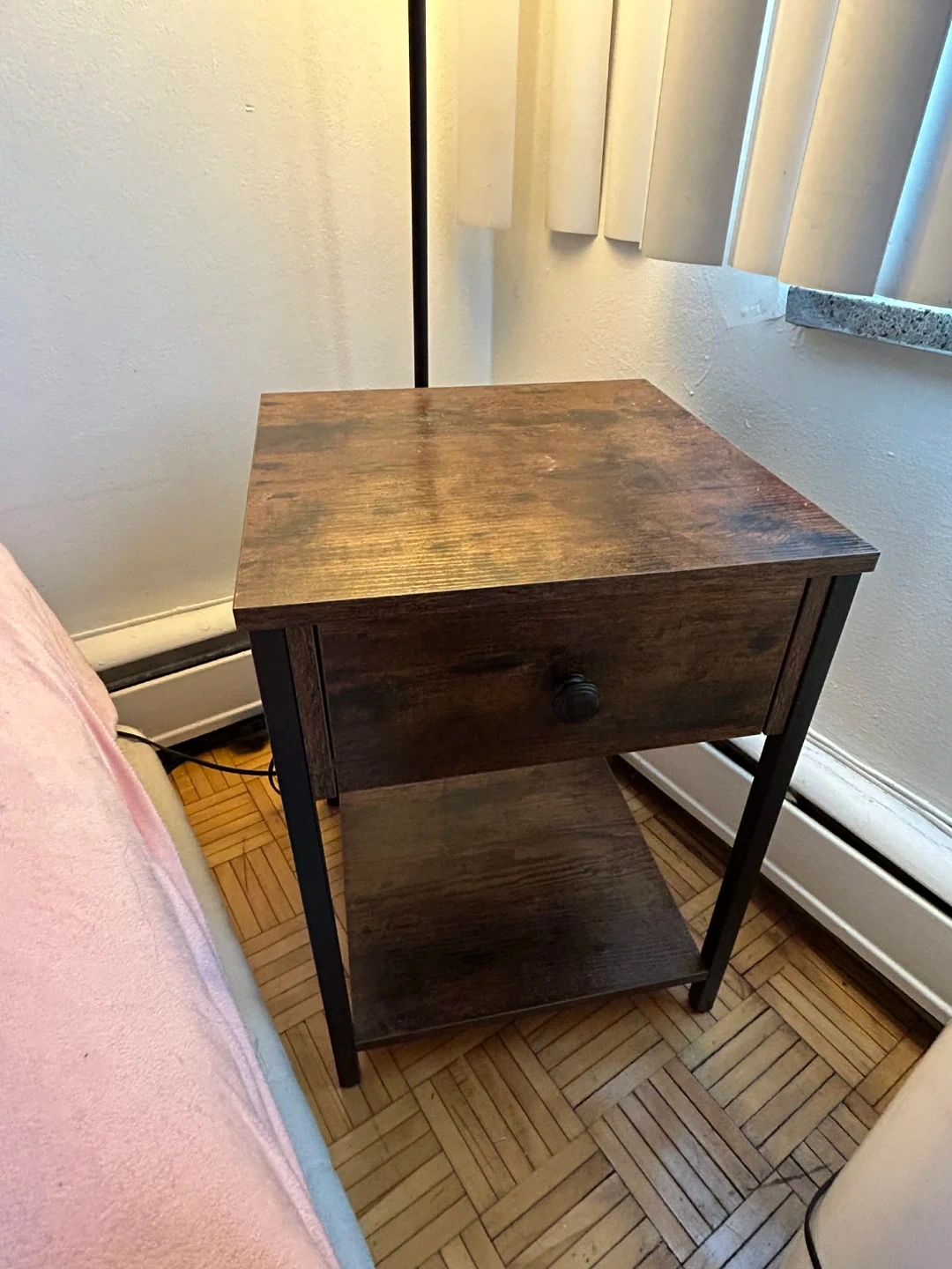 This nightstand has a dark wood finish with black metal legs. It's got one drawer and an open shelf below for extra storage. Measures approx. 15"W x 13"D x 24"H.