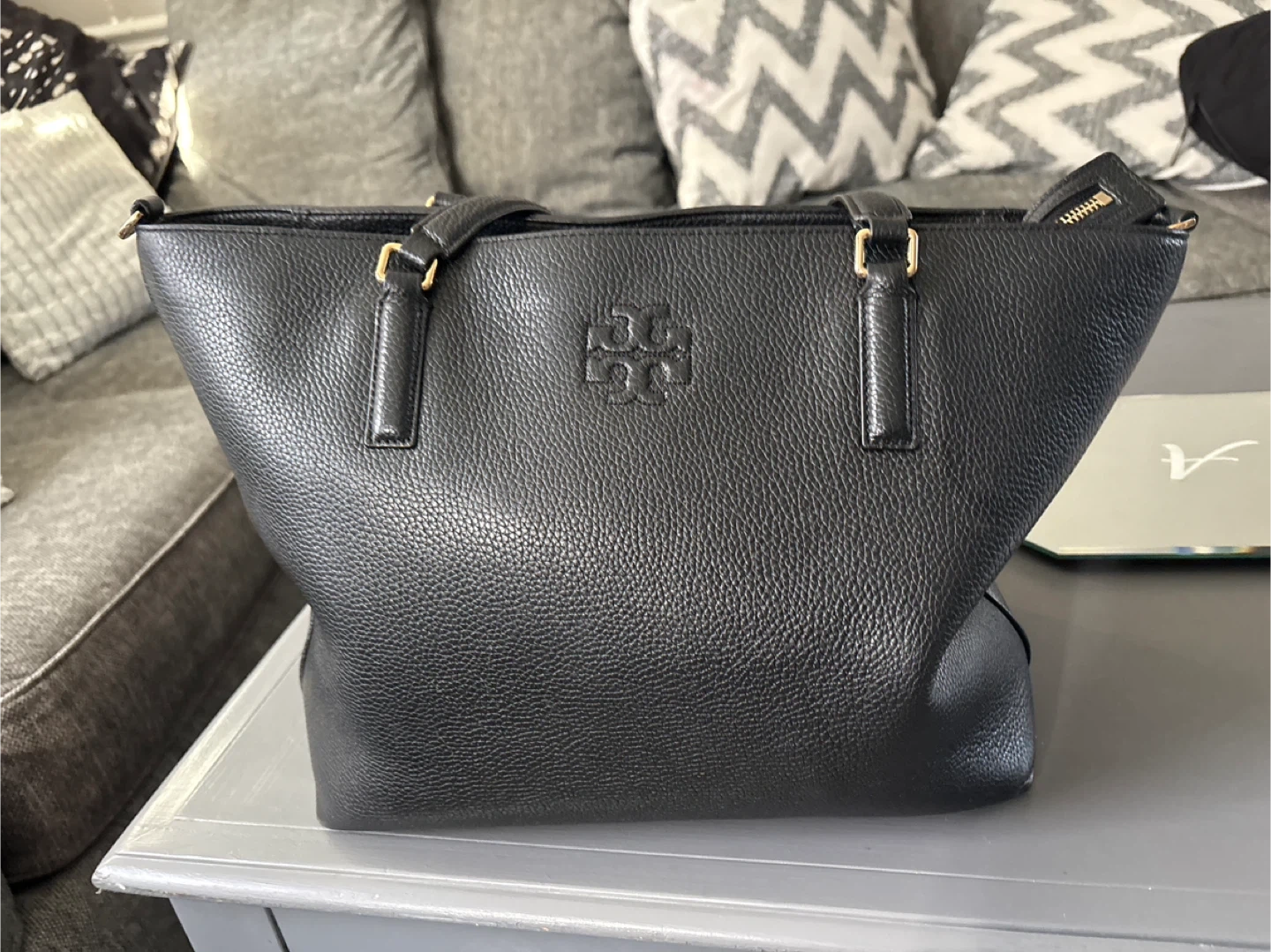 Selling a gently used Tory Burch black leather tote bag! It's in great condition and ready for a new owner. Perfect for everyday use or as a stylish work bag. The leather is soft and durable, and the classic design will never go out of style