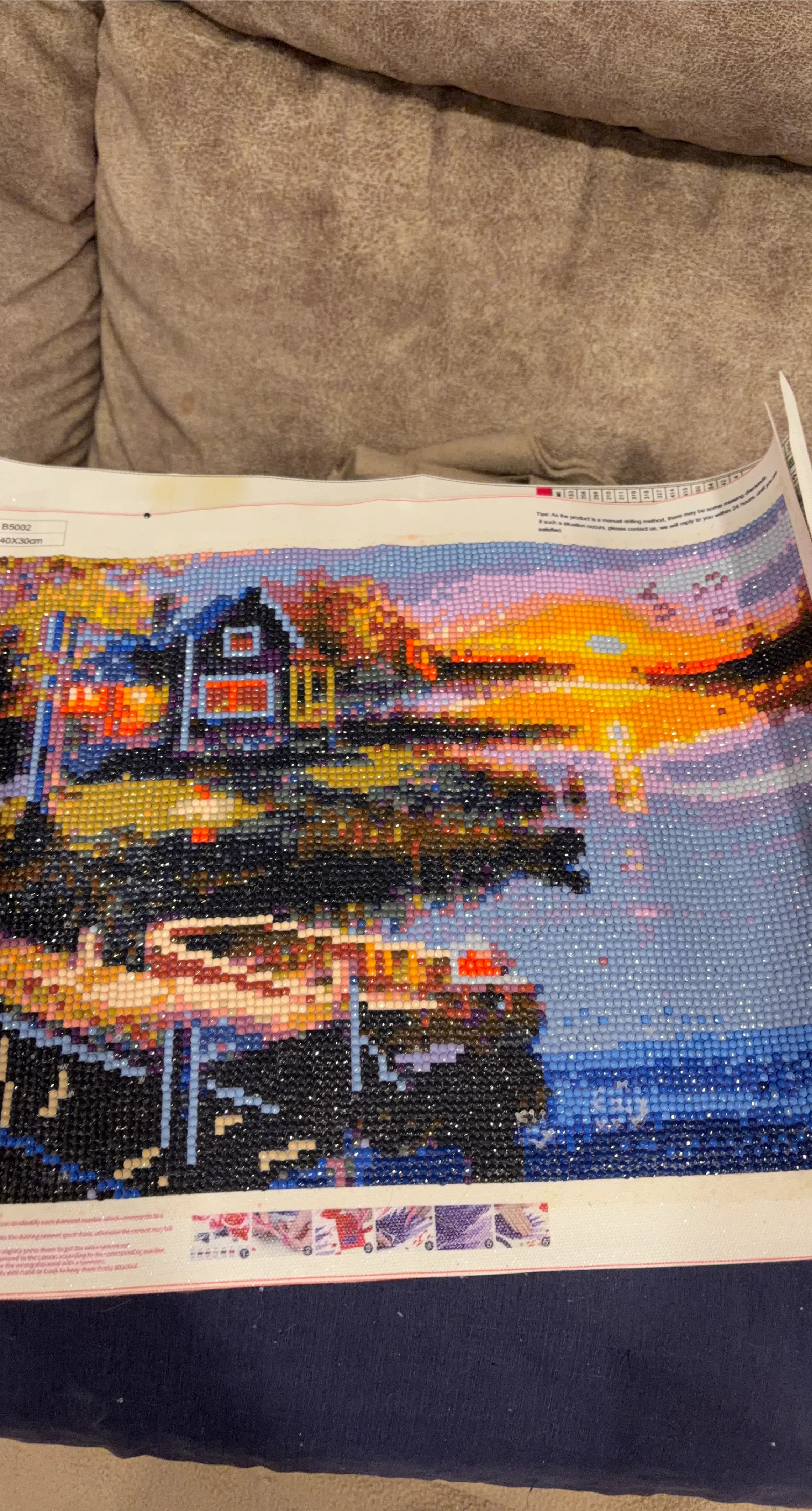 This is a diamond painting kit featuring a scenic lakeside sunset. The canvas size is 40x30cm. It's a manual drilling method kit.
