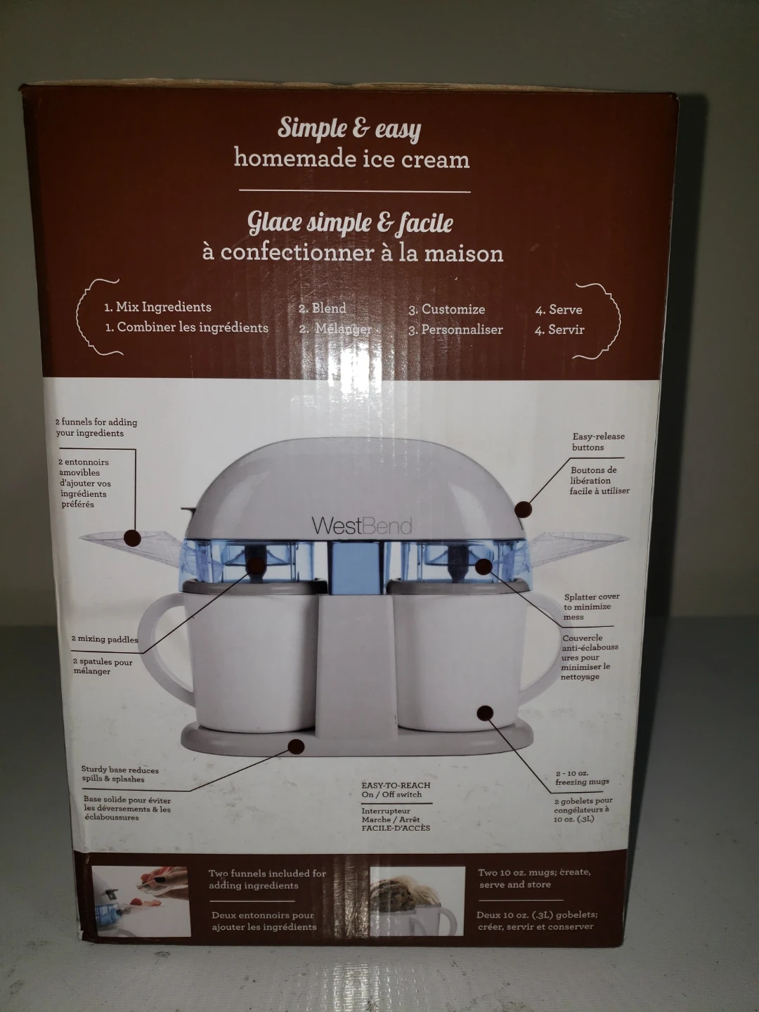 Make homemade ice cream with this dual single-serve machine. It includes two 10 oz. mugs that create, serve, and store. Easy-release buttons and a splatter cover make cleanup a breeze. It's simple to mix ingredients, blend, customize, and serve!
