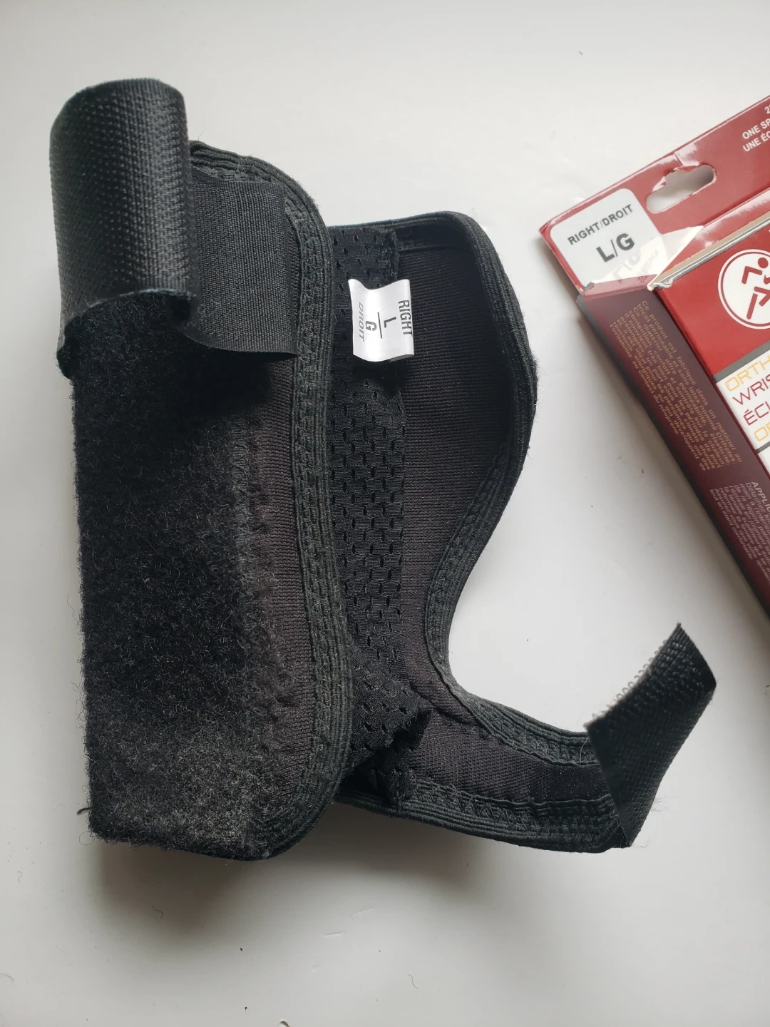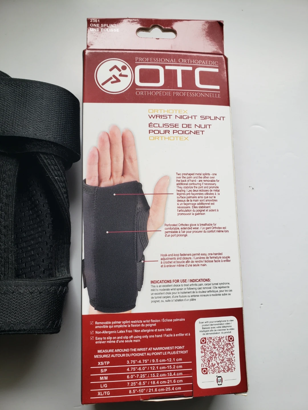 This is an OTC Wrist Night Splint, size L/G, for the right hand. It's made with a perforated glove for breathability and hook-and-loop fasteners. Latex free.