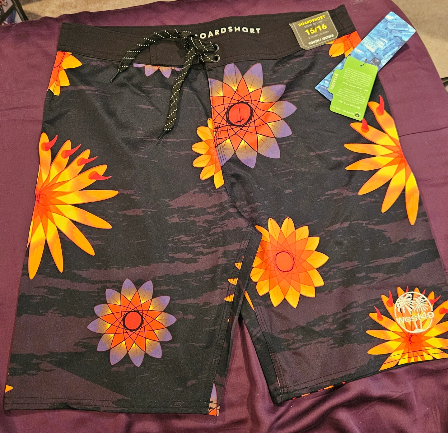 Men's West Forty Nine board shorts. Size 15/16. Black with orange and purple floral print. New with tags.
