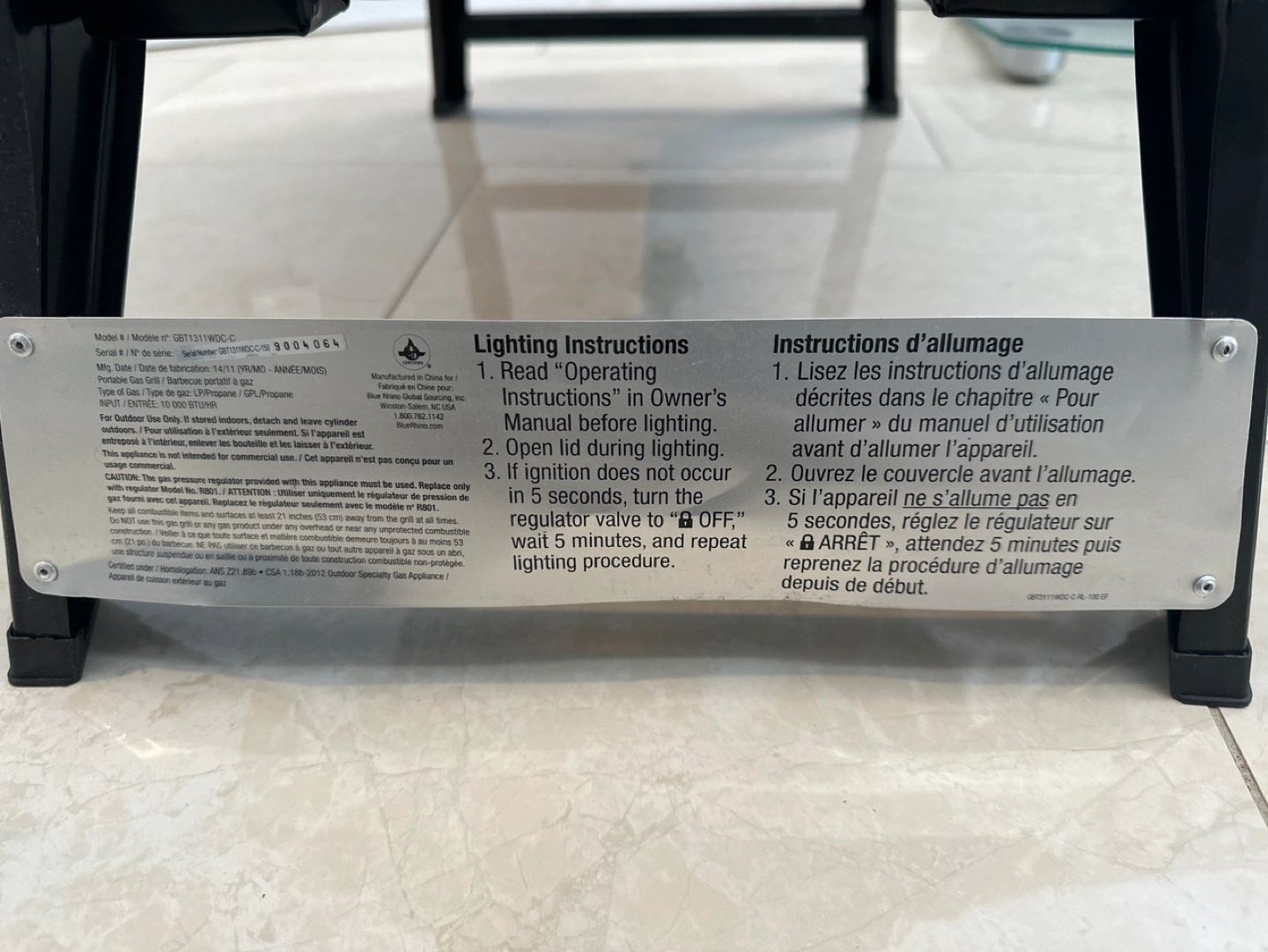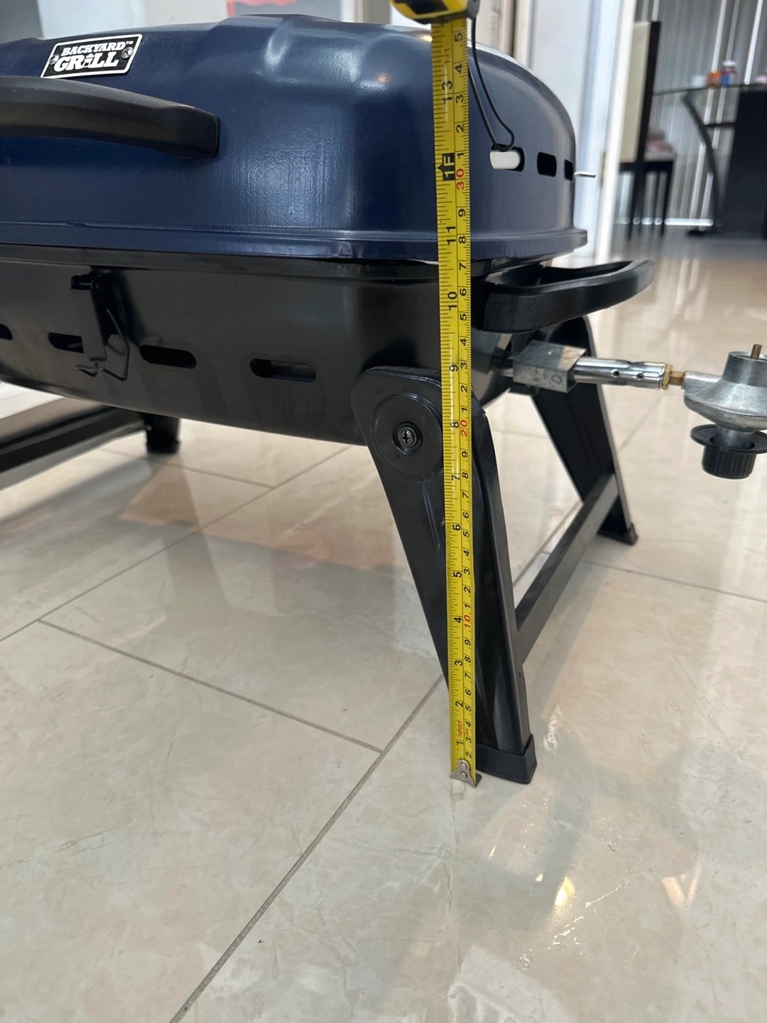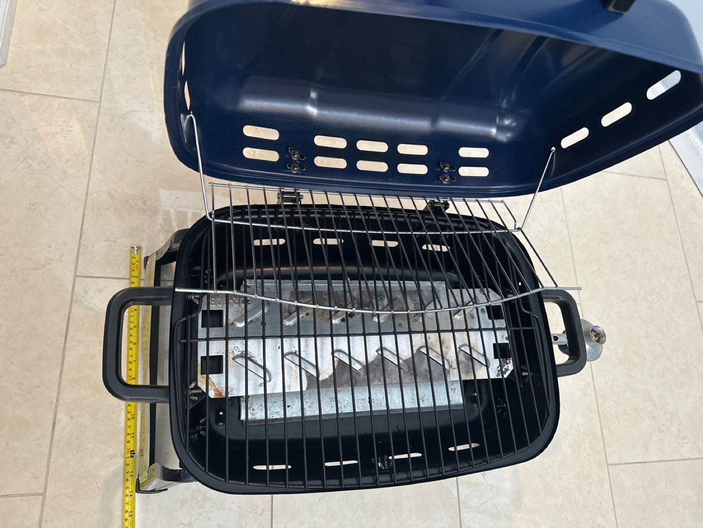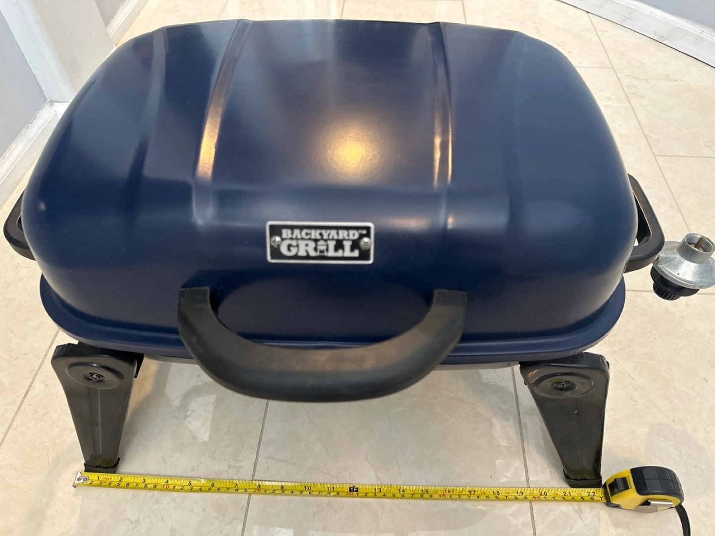 Small propane BBQ with folding legs. Blue and black. Includes grill grate and lid. Like new and was lightly used one time.
