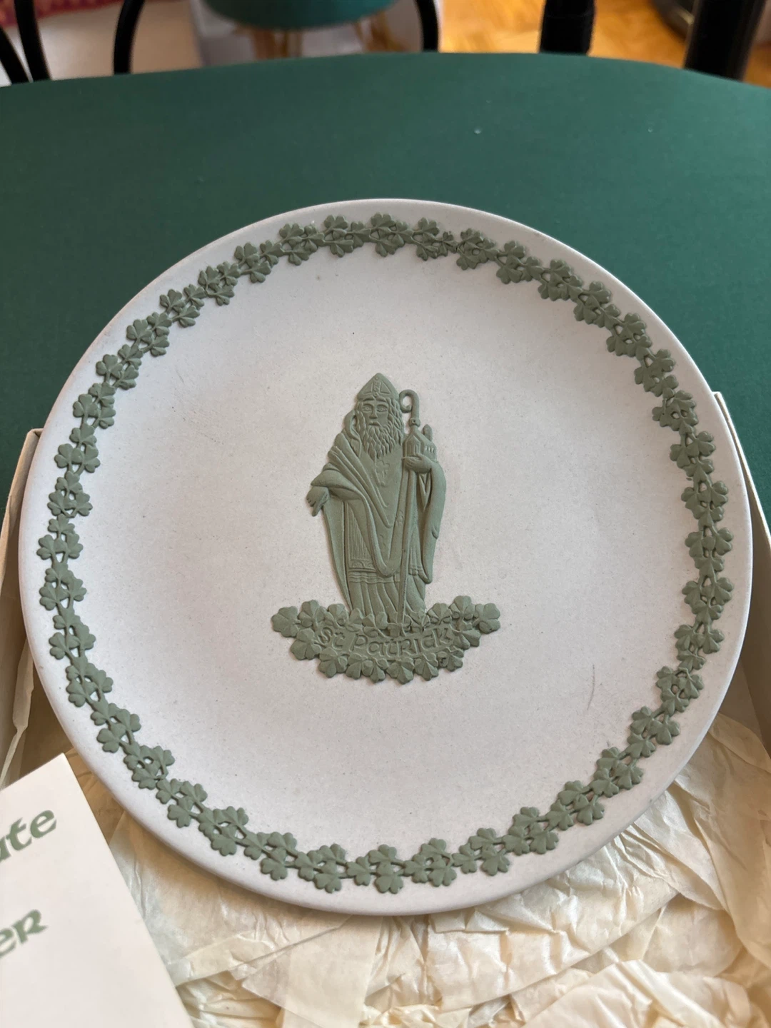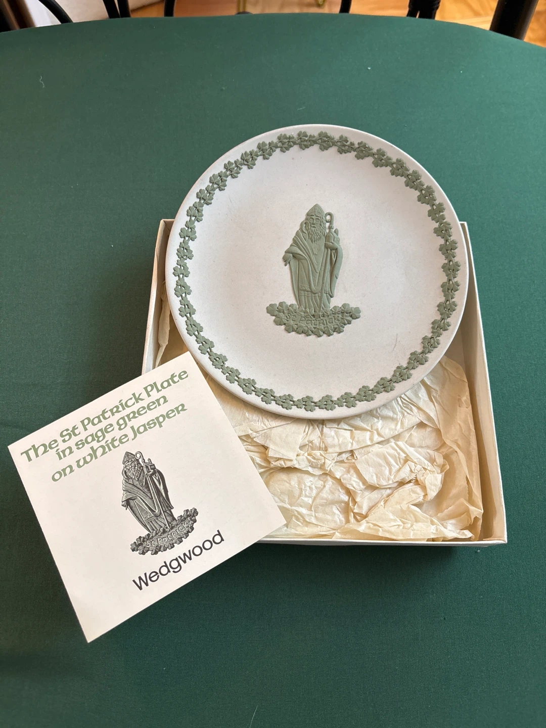 Selling a beautiful Wedgwood St Patrick Plate in sage green on white jasper. It comes with the original box and information card. A lovely piece for collectors!